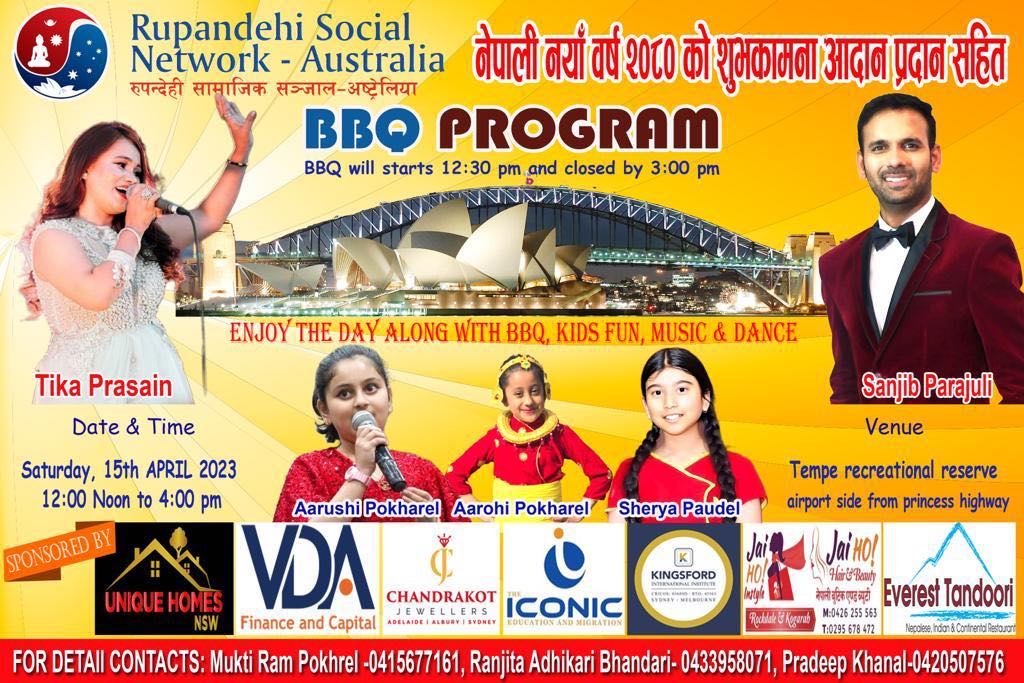 सिड्नी । रुपन्देही सामाजिक सञ्जाल अस्ट्रेलियाले नयाँ वर्ष २०८० सालको पावन अवसरमा शुभकामना आदान प्रदान कार्यक्रम गर्ने भएको छ ।सञ्जालले यही अप्रिल १५ तारिख शनिवार सिड्नीको टेम्पे रिक्रियशनल रिजर्भमा नयाँ वर्ष शुभकामना आदान प्रदान सहित बिबिक्यू कार्यक्रमको आयोजना गरेको छ ।
