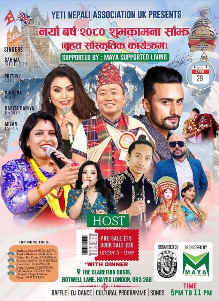 कार्यक्रम १२ बैशाख अर्थात २९ अप्रिल हेजस्थित The Claretian Oasis, Botwell Lane, UB3 2AB मा साँझ ५ देखि ११ बजेसम्म गरिने भएको छ ।