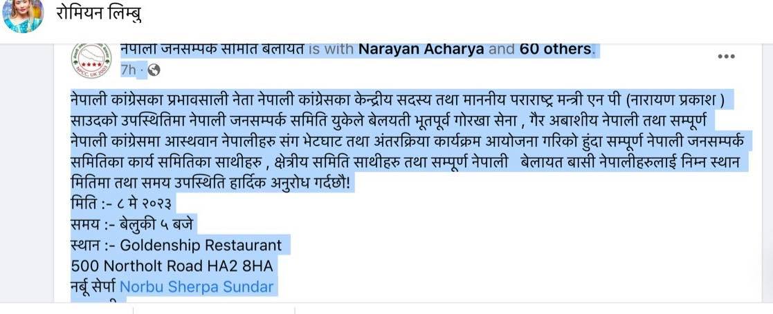 सभापति युवराज गुरुङले भूतपूर्व गोर्खा, गैर आवासीय नेपाली तथा सम्पूर्ण नेपाली कांग्रेसप्रति आस्थावान नेपालीहरुसंग भेटघाट तथा अन्तरकृया राखिएको उल्लेख गर्दै उपस्थितिका लागि अनुरोध गरेका छन् । परराष्ट्रमन्त्री साउद बेलायती राजा चार्ल्स तृतीयको ६५ मेमा हुने राज्याभिषेकमा सहभागी हुन अहिले लन्डनमा छन् ।
