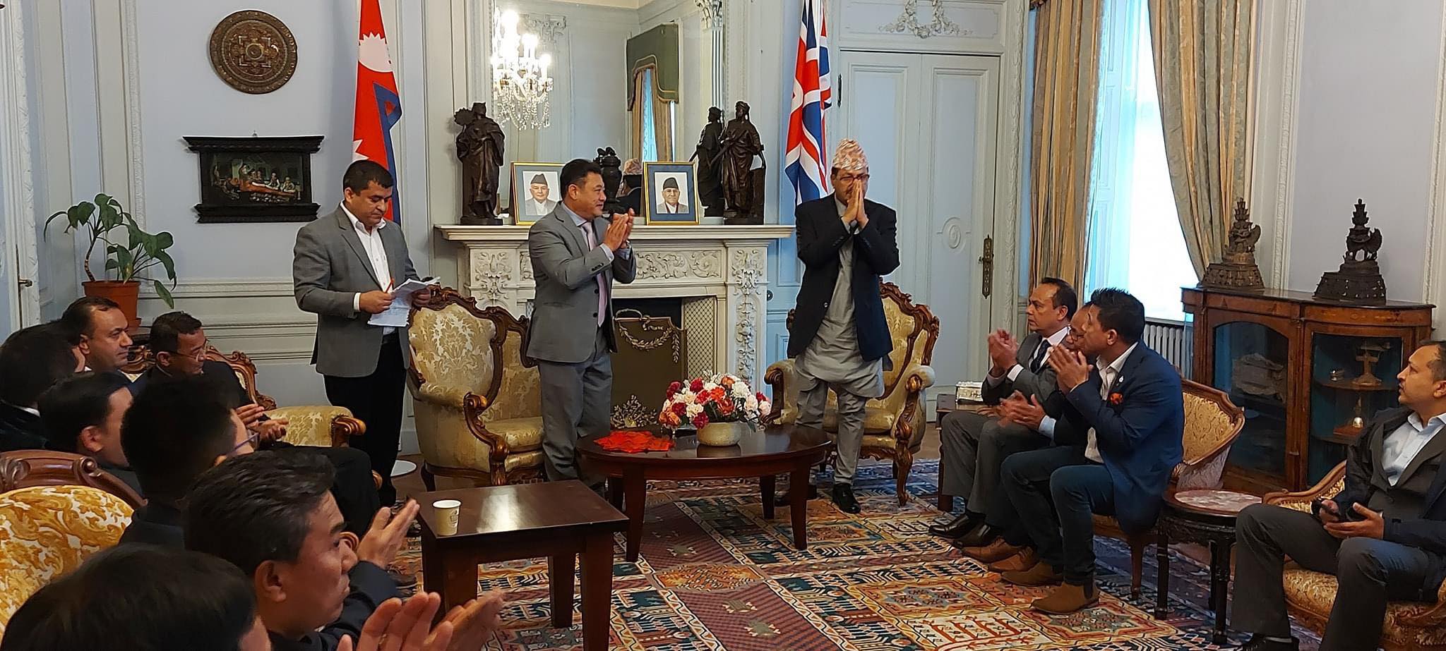’ राजदूत राज्यका तर्फबाट प्रतिनिधि भएपनि नागरिकहरु देशका वास्तविक सांस्कृतिक राजदूत भएको उल्लेख गर्दै उनले भने, ‘दुई देशबीच सम्बन्धको विकास, विस्तार र मान सम्मान अभिवृद्धि गर्न बेलायत बस्ने नेपालीहरुको निर्णायक र महत्वपूर्ण योगदान रहन्छ ।’ मन्त्री साउदले नेपालमा लगानीमैत्री वातावरण भएकाले उद्यम र लगानी गर्न बेलायतको नेपाली डायस्पोरालाई अनुरोध गरे । ‘संविधान आइसकेको छ, द्वन्द्व समाप्त भइ सर्वस्वीकृत दुईवटा चुनाव पनि भइसकेको छ । लगानीमैत्री वातावरणबाट प्रतिफल लिने पहिलो हक गैर आवासीय नेपालीको हुन्छ । उधमशीलताका लागि नेपाल आउनुस् म नेपाल सरकारका तर्फबाट स्वागत गर्न चाहन्छु’, उनले भने ।