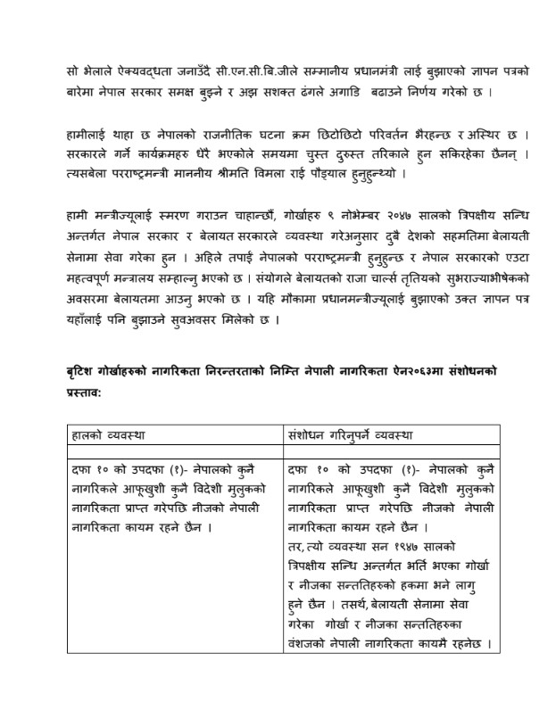 लन्डन । लण्डनमा परराष्ट्रमन्त्री साउदसँग नागरिक निरन्तरता अभियानका अभियन्ताहरुले नेपालका परराष्ट्रमन्त्री माननीय एनपी साउद लाई गोर्खा र उनीहरुको सन्ततिको निम्ति वंशजको नेपाली नागरिकताको निरन्तरता रहनुपर्छ भन्दै एक ज्ञापन पत्र बुझाएका छन् ।