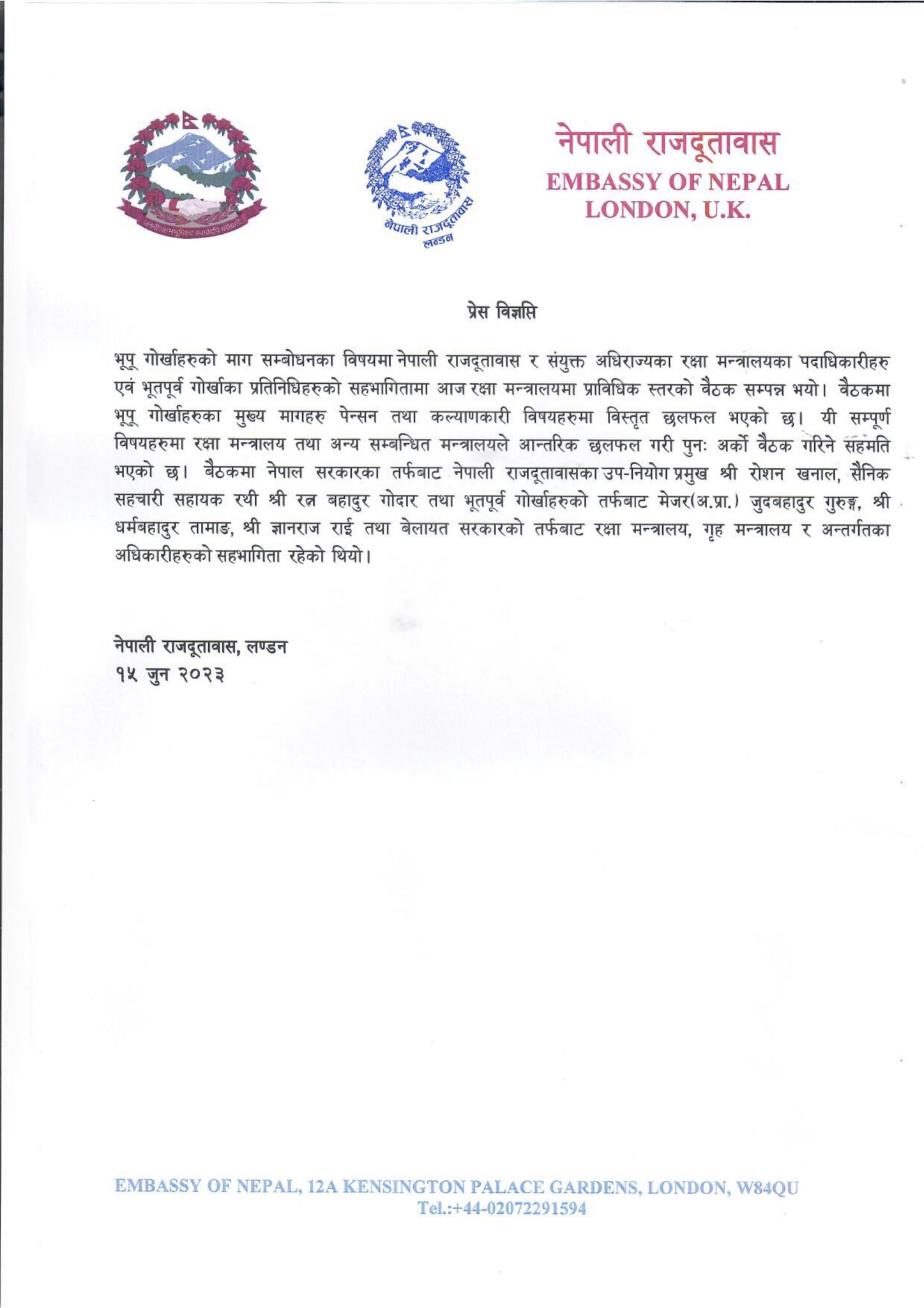 लन्डनस्थित रक्षा मन्त्रालयमा आयोजित बैठकमा भूपू गोर्खाहरुका मुख्य मागहरु पेन्सन तथा कल्याणकारी विषयहरुमा विस्तृत छलफल भएको लन्डनस्थित नेपाली दूतावासले बिहीबार जनाएको छ। यी सम्पूर्ण विषयमा रक्षा मन्त्रालय तथा अन्य सम्बन्धित मन्त्रालयले आन्तरिक छलफल गरी पुनः अर्को बैठक गरिने सहमति भएको छ ।