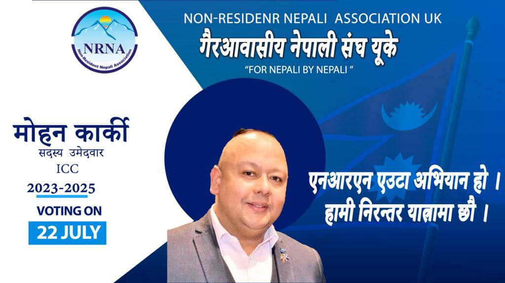 लण्डन । गैर आवासीय नेपाली संघ (एनआरएनए) युकेको जुलाई २२ मा हुने निर्वाचनको माहौल सँगै आईसीसी सदस्य पदका उमेदवार मोहन कार्कीको नाम चर्चामा रहेको छ । समाजसेवी, स्पष्ट वक्ता, निडर व्यवितत्व मोहन कार्की एनआरएनए युकेको एक सुपरिचित नाम हो । एनआरएनए युकेको दुई कार्यकाल उपाध्यक्ष (२०१९–२१, २०२१–२३) एनआरएनए स्कटल्याण्डको संस्थापक अध्यक्ष (२०१७–१९) समेत रहेका कार्की विभिन्न सामाजिक संस्थाहरूमा समेत आबद्ध छन् । फोर्थ भ्याली नेपाली एशोसिएसनका अध्यक्ष समेत रहेका कार्की दुई कार्यकाल ग्लास्गो नेपाली एशोसिएसनको अध्यक्ष समेत थिए । एनआरएनए युकेको निर्वाचनमा प्रमुख पदहरुमा प्यानल बनेपनि सबैका प्रिय मोहन कार्की आईसीसी सदस्य पदमा साझा उमेदवारको रुपमा मैदानमा उत्रेका छन् समाजसेवा र एनआरएन अभियानमा लामो समय काम गरेका उनलाई आईसीसी सदस्यका उमेदवार कार्कीले सबै संग भोटको अपिल गरेका छन् ।