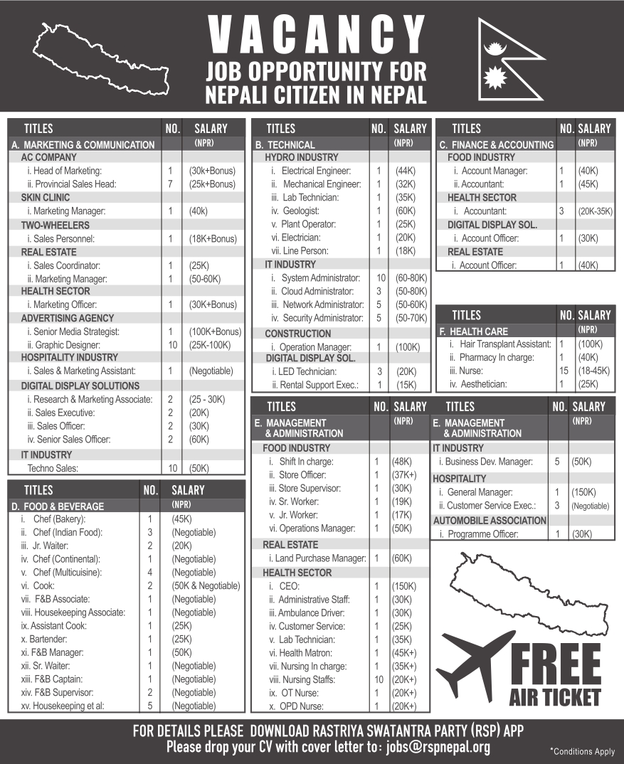उक्त सुचना बुधबार पत्रकार सम्मेलन मार्फत सार्वजनिक गर्ने तैयारी गरिएको छ । राष्ट्रिय स्वतन्त्र पार्टी केन्द्रीय कार्यालयद्धारा माग गरिएको आवेदनमा मार्केटिङ र सञ्चार, प्राविधिक, फाईनान्सियल र एकाउण्टिङ, हेल्थ केयर, होटल, व्यवस्थापन लगायतका क्षेत्रमा दक्ष कामदारहरुले आवेदन दिन सकिने बताईएको छ ।