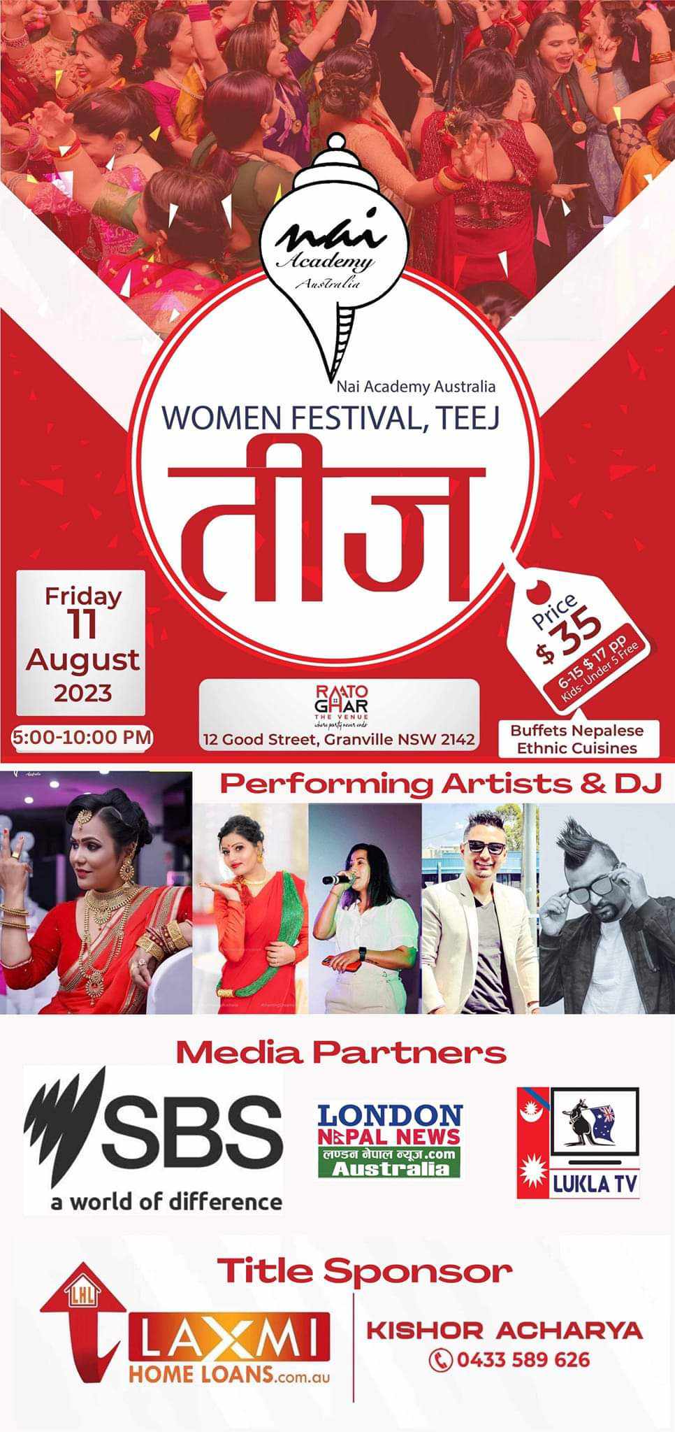 सिड्नी । नई एकेडेमी अस्ट्रेलियाले ३ जना वर्ष नारी घोषणा गरी सम्मान सहित अवार्ड तथा तीज महोत्सव गर्ने भएको छ । ११ अगष्ट ग्रानभिलको रातो घरमा एकेडेमीले अस्ट्रेलिया भर रहेका विभिन्न विधामा उत्कृष्ट नारीहरुलाई “नइ एकेडेमी अस्ट्रेलिया वुमन अफ द इयर- २०२३” अवार्डद्धारा सम्मान गर्ने कार्यक्रम रहेको नई एकेडेमी अस्ट्रेलिया अध्यक्ष सिमा रोसीले जानकारी दिईन् ।