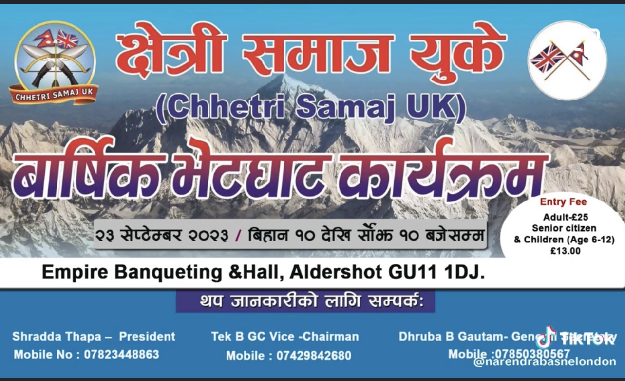 लण्डन । क्षेत्री समाज बेलायतले आफ्नो वार्षिक भेटघाट कार्यक्रम अर्थात (हिउँदे भेला ) आउँदो २३ सेप्टेम्बर शनिबार बिहान गर्ने ब्यापक तयारीमा छ