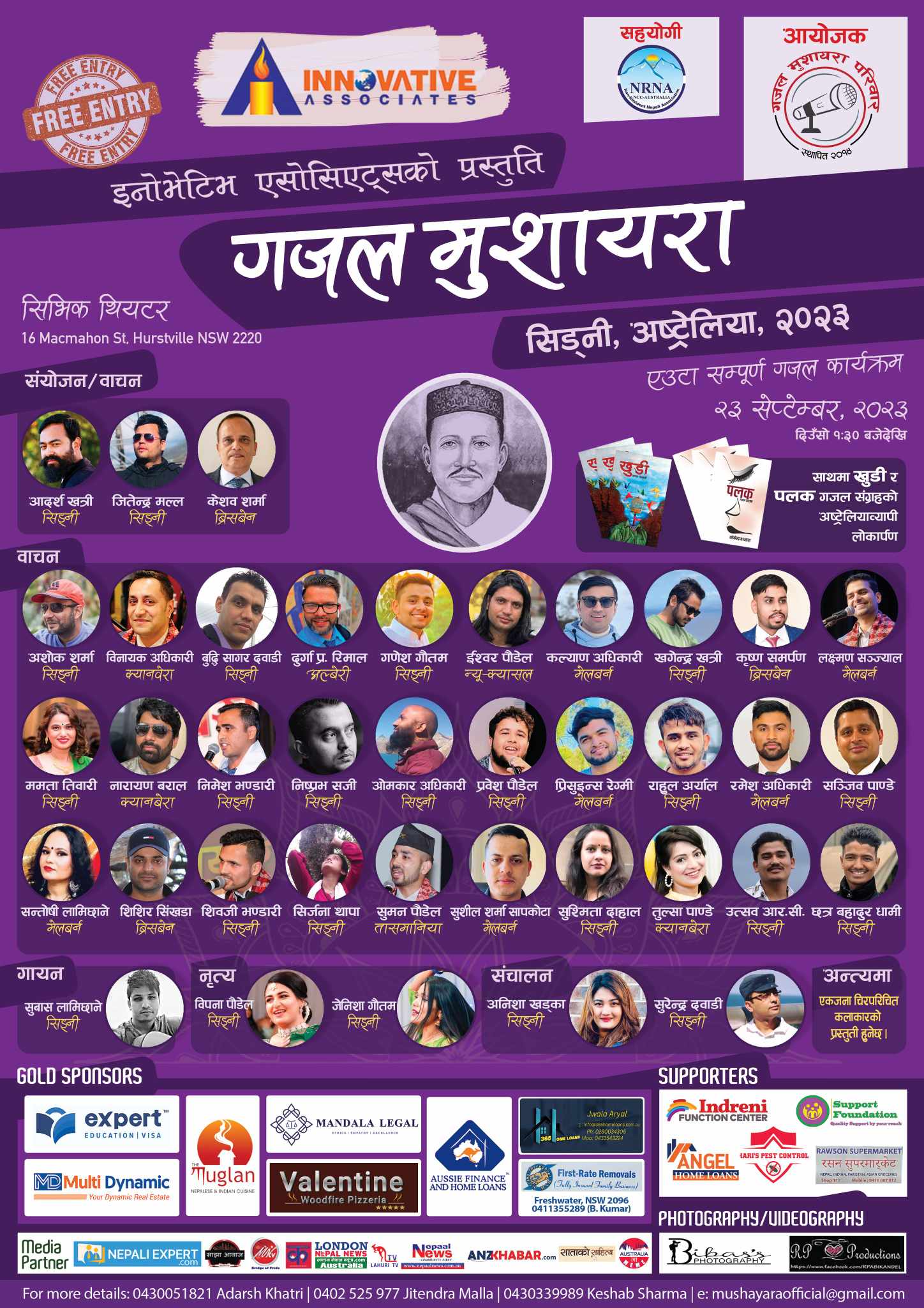 सिड्नी । अस्ट्रेलियामा रहेका गजल प्रेमी र सर्जकहरुले हरेक वर्ष आयोजना गर्दै आएको “गजल मुशायरा” कार्यक्रम यस वर्ष पनि हुने भएको छ । गजल मुशायरा परिवारको आयोजनामा २३ सेप्टेम्बर सिड्नी स्थित सिभिक थियटरमा उक्त कार्यक्रम आयोजना गरिएको छ ।
