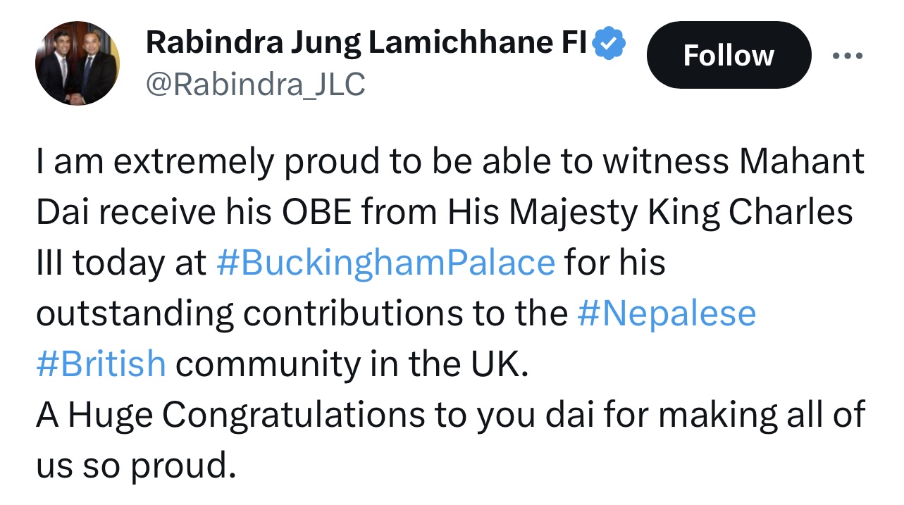 बेलायती राजाबाट महन्त श्रेष्ठले पाए प्रतिष्ठित’ओबीइ’ सम्मान,