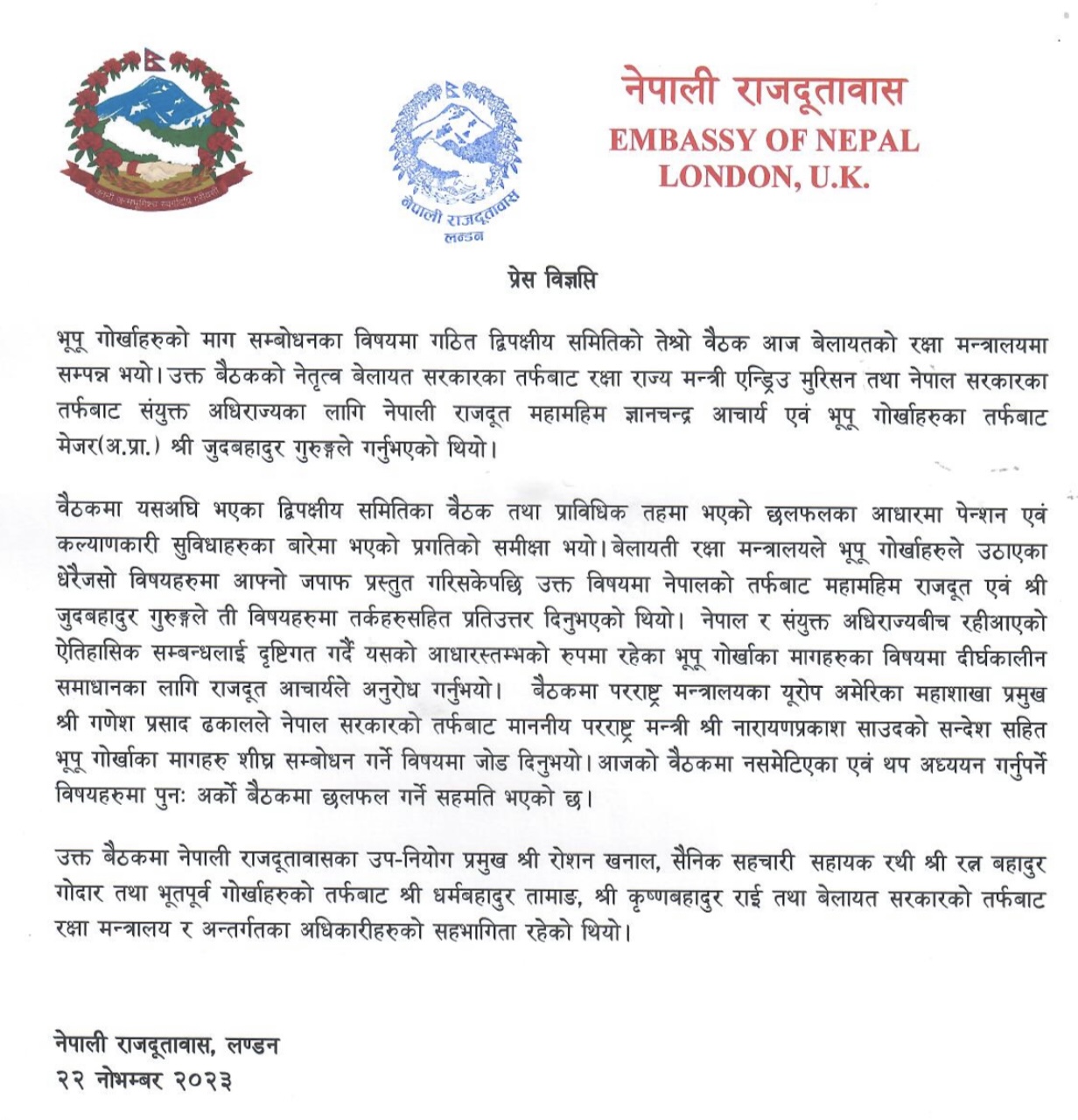 बैठकमा परराष्ट्र मन्त्रालयका यूरोप अमेरिका महाशाखा प्रमुख गणेशप्रसाद ढकालले नेपाल सरकारको तर्फबाट परराष्ट्रमन्त्री नारायणप्रकाश साउदको सन्देशसहित भूपू गोर्खाका मागहरु शीघ्र सम्बोधन गर्ने विषयमा जोड दिए ।