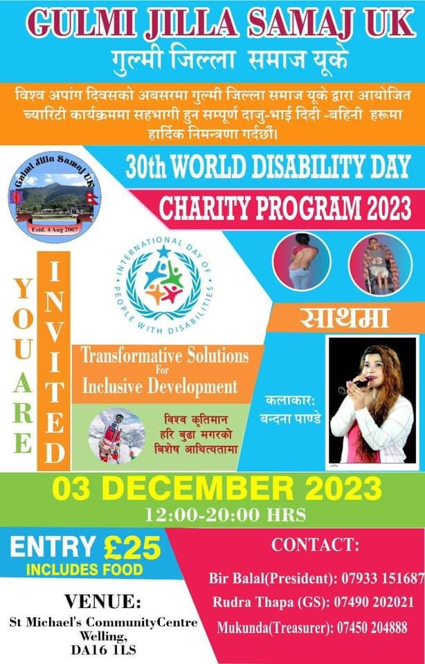 लन्डन । गुल्मी जिल्ला समाज यूकेले च्यारिटी कार्यक्रम गर्ने भएको छ। विश्व अपांगता दिवसको अवसरमा वर्षेनी गरिंदै आएको कार्यक्रम डिसेम्बर ३ तारिख आइतबार साउथ इष्ट लन्डनको वेलिङस्थित सेन्ट माइकल्स कम्युनिटी सेन्टरमा गरिने भएको हो।