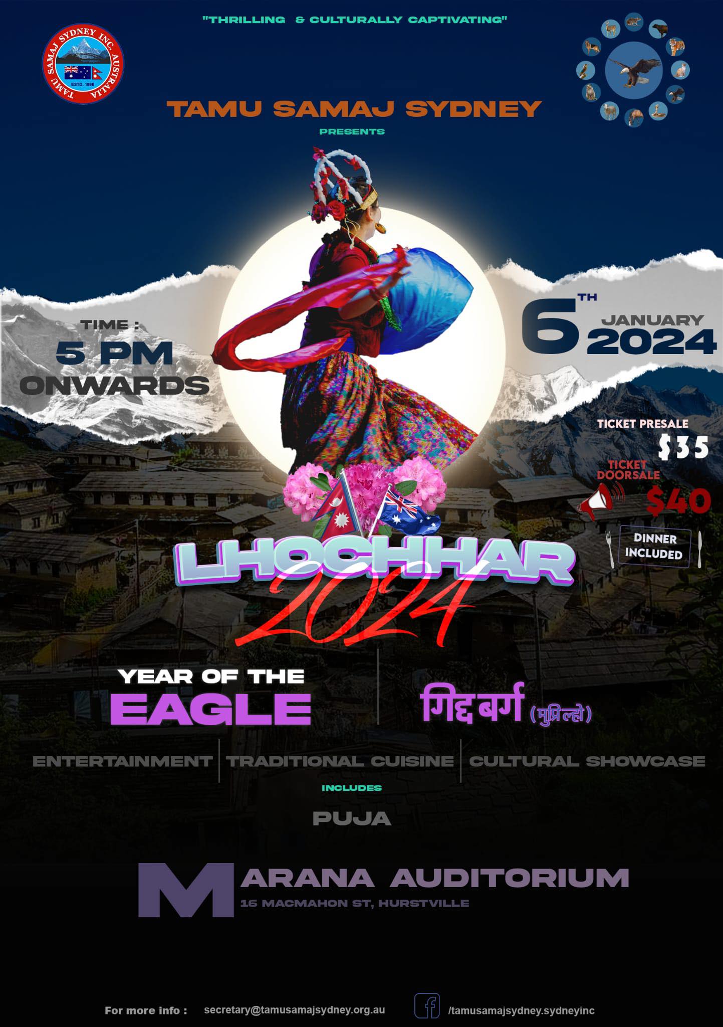 सिड्नी । तमु समाज सिड्नीले तमु ल्होछार पर्वको अवसरमा आयोजना गरेको कार्यक्रमको भव्य तैयारी अन्तिम चरणमा पुगेको छ ।तमु ल्होछारका अनुसार १२ वर्ग चक्र मध्ये विरालो वर्गलाई विदाई गर्दै यस वर्ष गिद्ध वर्गलाई स्वागत गरिदै छ । समाजले सांस्कृतिक पर्व तमु ल्होछारको अवसरमा यही जनवरी ६ तारिख माराना अडोटेरियममा बेलुकी ५ बजे देखि ‘ल्होछार कल्चरल क्र्यु’ कार्यक्रमको आयोजना गरेको छ ।