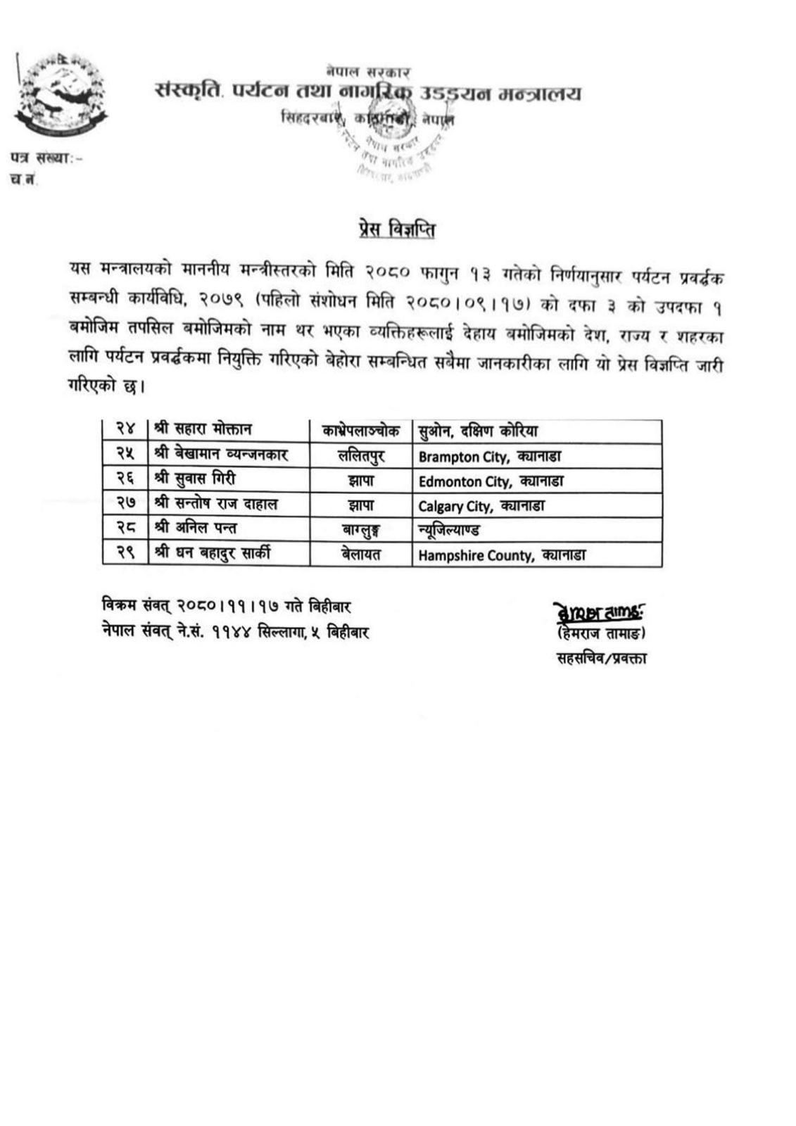 मन्त्रालयले बिहीबार २९ जनालाई विभिन्न देश, राज्य र सहरका लागि पर्यटन प्रवर्द्धकमा नियुक्ति गरेको हो ।