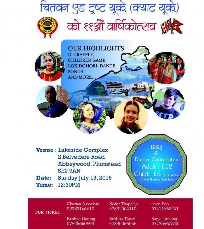 (क्याट यूके) चितवन एड ट्रस्ट, यूके आफनो स्थापनाको एघारौं वार्षिकोत्सव मनाउने तयारीमा जुटेको छ । चितवनबाट बेलायतमा आई बसेकाहरुको सांझा संस्थाका रुपमा रहेको क्याट यूकेले यहि जुलाई १९ मा एक विशेष कार्यक्रमबीच वार्षिकोत्सव तथा छैटौं अधिवेसन गर्दैछ । सन् २००४ जुन २६ मा स्थापित उक्त संस्थाका हाल करिब ५ सय साधारण र एकसय ५० आजीवन सदस्य छन् । यसले चितवन जिल्लाका गरिव अनि सिमान्तकृत जनताका लागि आर्थिक सहयोग साथै स्वास्थ्य र शिक्षाका क्षेत्रमा सरहानीय काम गरेको छ । अहिले संस्थाले भूकम्पबाट जिल्लामा क्षतिग्रस्त विद्यालय पुनर्निर्माणका लागि आर्थिक संकलन गरिरहेको छ ।