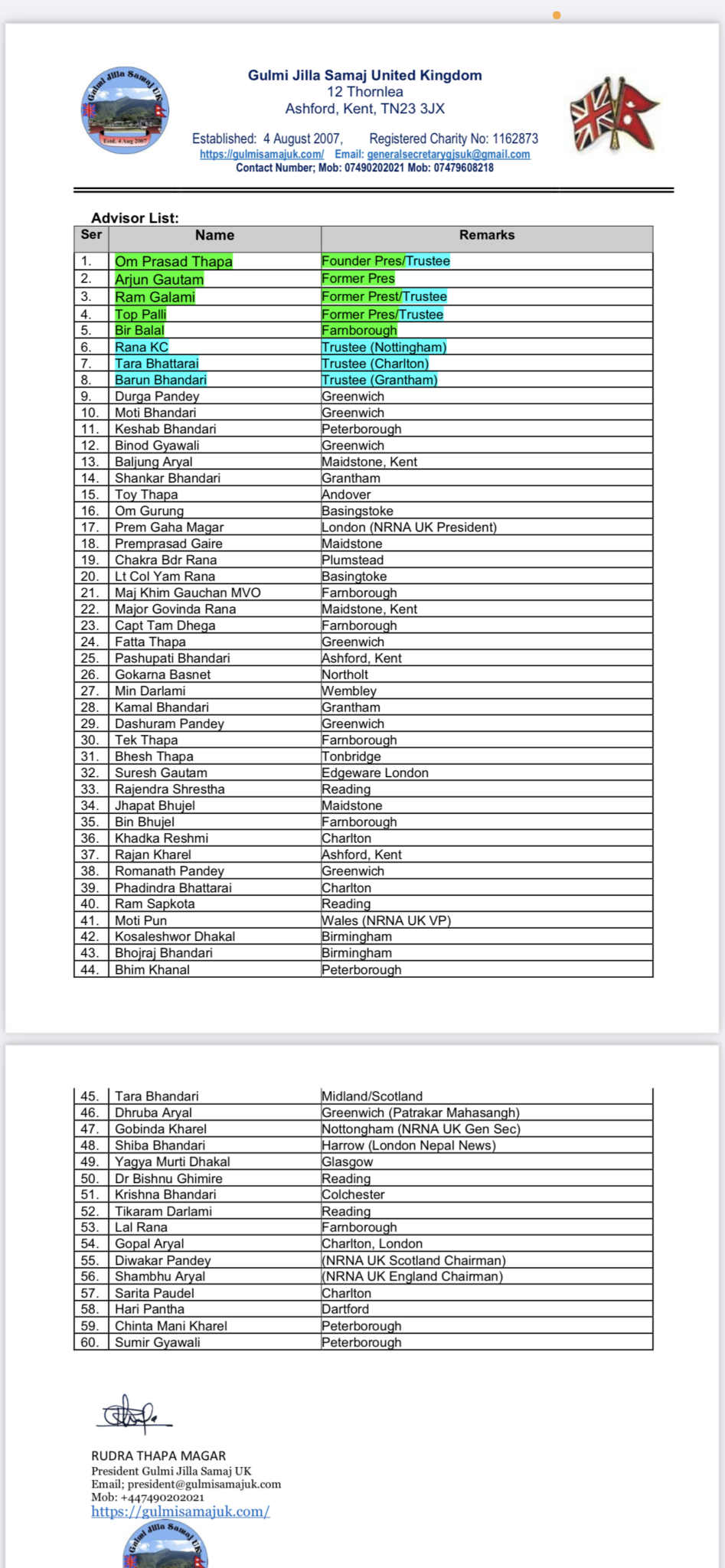 गुल्मी जिल्ला समाज यूकेले गर्र्यो ६० सल्लाहकार मनोनित को को परे (सूची सहित)