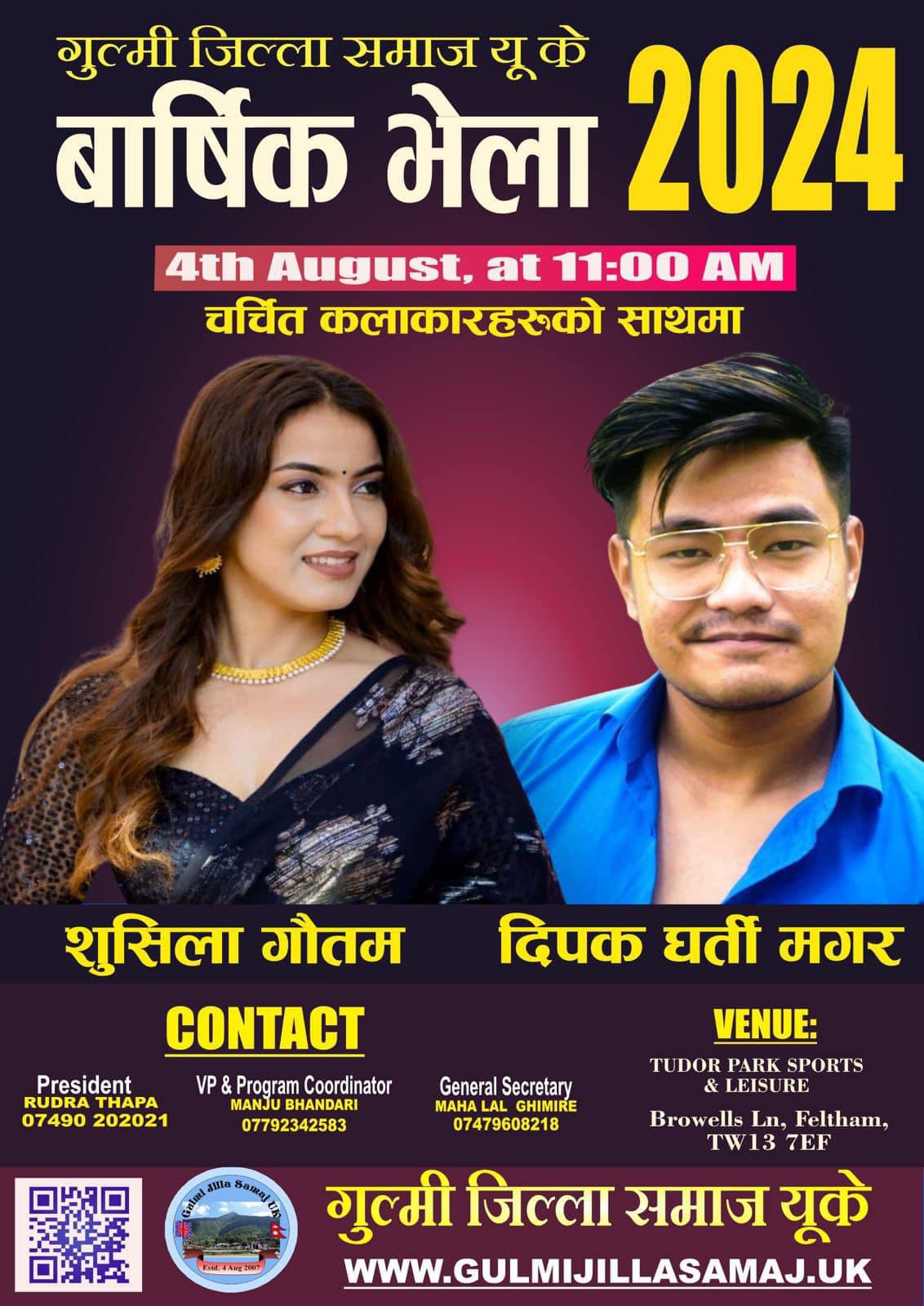 लन्डन । बेलायतको गुल्मेली भेला आगामी अगष्ट पहिलो साता हुने भएको छ । मेलामा सांगीतिक प्रस्तुति दिन गुल्मेली कलाकार गायिका सुशिला गौतम र गायक दिपक घर्ति आउने पक्का भएको छ ।