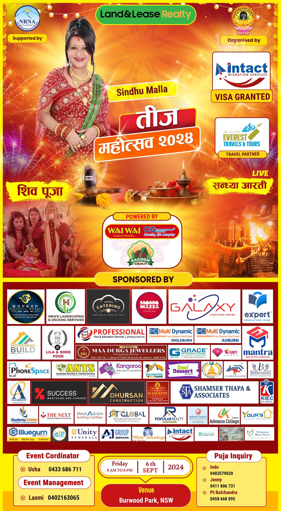 सिड्नी । हिन्दु नेपाली नारीहरुको महान पर्व हरितालिका तीजको अवसर पारेर विगतका वर्षहरुमा जस्तै यसवर्ष पनि हिन्दु समाज अस्ट्रेलियाले तीज महोत्सव २०२४ आयोजना गर्ने भएको छ । समाजले यही ६ सेप्टेम्बरमा तीज पर्वकै दिनको अवसर पारेर बरउड पार्कमा ऐतिहासिक तीज महोत्सव गर्न लागेको हो । सकारात्मक उर्जा बोकी समुहमा जुटौं सिड्नीमा हुने नेपालीहरु कोहि नछुटौं भन्ने मुख्य अभिप्रायका साथ यसवर्ष नेपालको पशुपति मन्दिरमै पूजा गरे जस्तो महशूस गराउने हेतुले पशुपतिनाथको मूर्ति प्रतिस्थापना सहित पुजाआजा कार्यक्रमको आयोजना गरिएको समाजकी अध्यक्ष लक्ष्मी बास्ताकोटीले जानकारी दिईन् ।