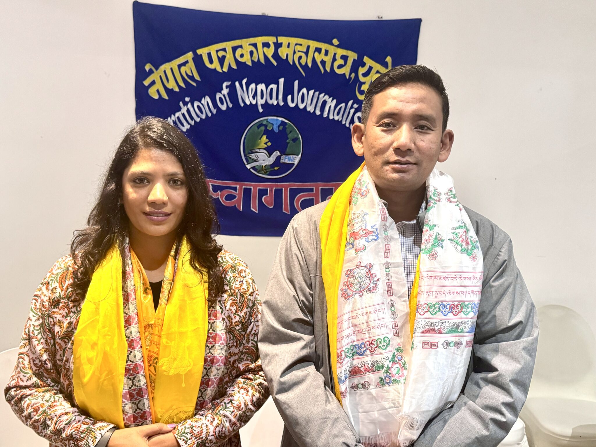 पत्रकार महासंघ बेलायत शाखा अध्यक्ष विमला सेनेले गुरुङ र अधिकारीलाई खादासहित मायाको चिनो प्रदान गरिन् ।