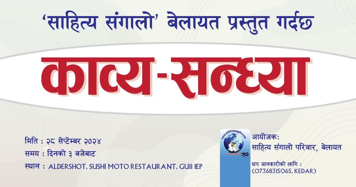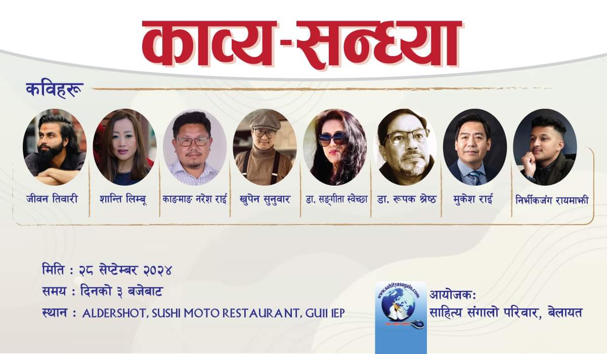 लन्डन । बेलायतमा पहिलोपटक संगीतको साथमा आठ कविले एकै मञ्चबाट कविता सुनाउने भएका छन् । एल्डरसटमा यही सेप्टेम्बर २८ तारिख शनिबार (Sushi moto restaurant) हुन लागेको काव्य-सन्ध्या नामक कार्यक्रममा आठ कविले कविता प्रस्तुत गर्नेछन् ।