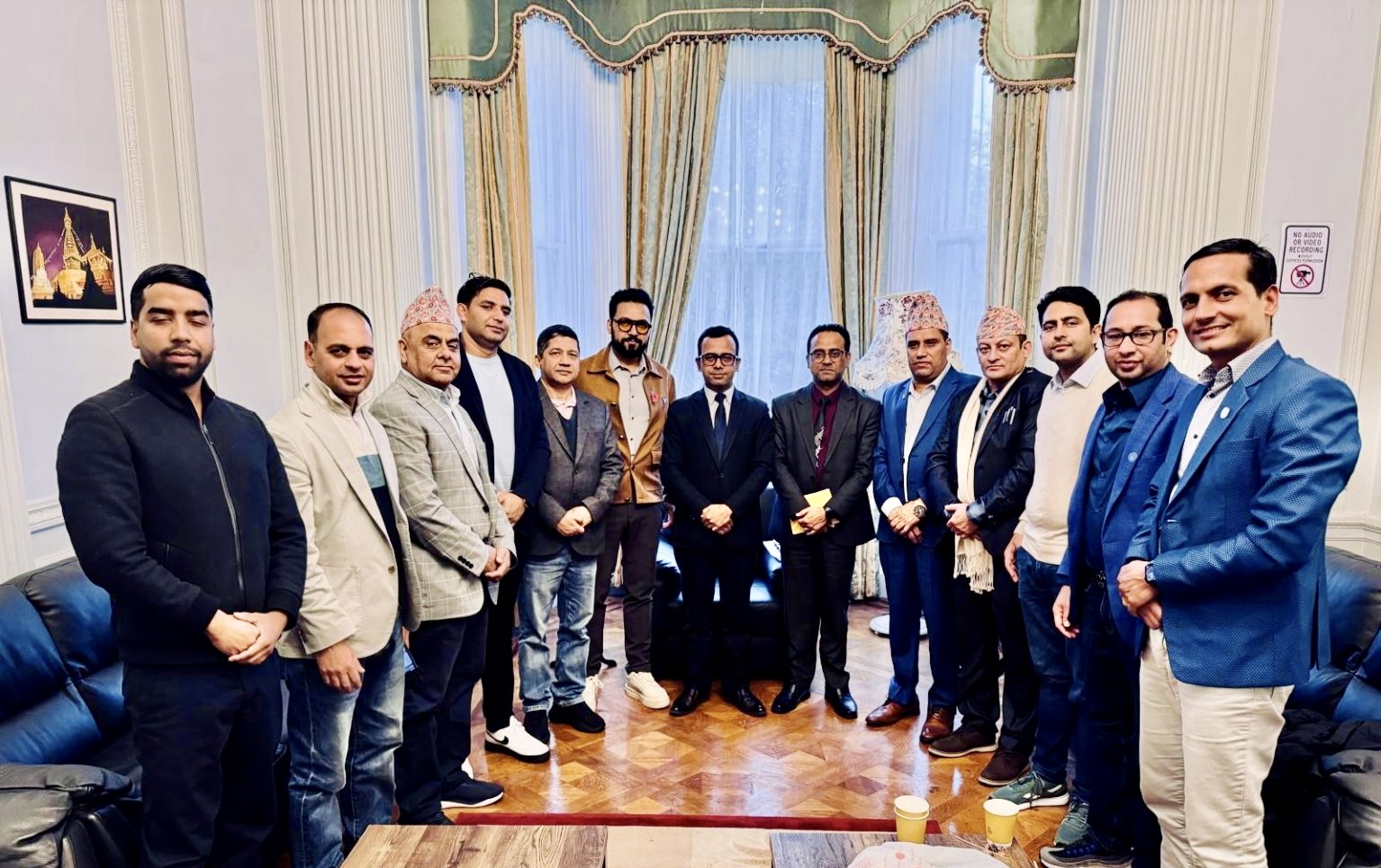 ज्ञापनपत्र बुझाउन सभापति शर्मासंगै उपसभापति कोशलेश्वर ढकाल, प्रवक्ता विष्णु चालिसे, सदस्यहरु डिलाराम गौतम, भोजराज कंडेल, लन्डन क्षेत्रीय सभापति राम थापा, मिडल्यान्ड क्षेत्रीय उपसभापति दिनेश खरेल, क्षेत्रीय सदस्यहरु बलराम चापागाईं, शालिक सापकोटा, विद्यार्थी विभाग सदस्य रमेश बेल्वासे र चार्टर्ड अकाउन्टेन्ट अर्जुन कटुवाल दूतावास पुगेका थिए।