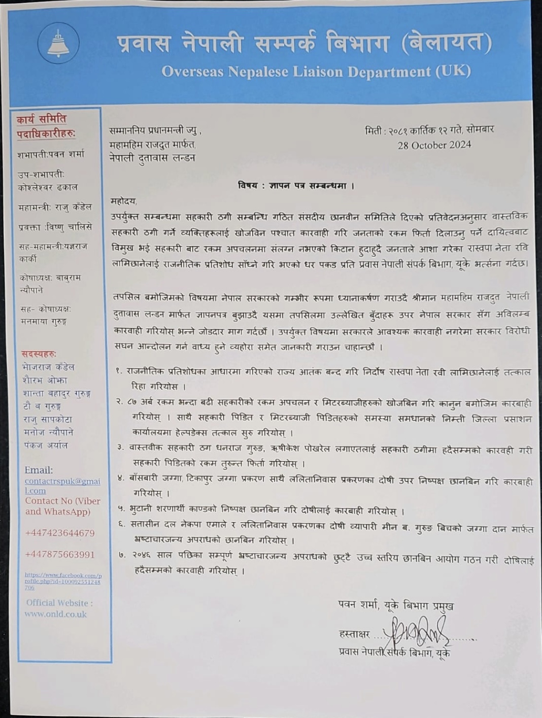 रास्वपा प्रवास समन्वय विभाग यूकेले पूर्व उपप्रधान एवम् गृहमन्त्रीसमेत रहेका सभापति लामिछानेलाई राजनीतिक प्रतिशोधका आधारमा पक्राउ गरिएको दावी गर्दै तत्काल रिहा गर्न मागसहित दूतावासमार्फत् नेपाल सरकारलाई ज्ञापन बुझाएको हो ।