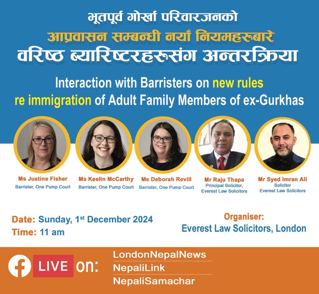 लन्डन । लन्डनका वरिष्ठ ब्यारिष्टरहरुसंग भूतपूर्व गोर्खा परिवारको अध्यागमन सम्बन्धि नयां नियमबारे अन्तरक्रिया हुने भएको छ ।