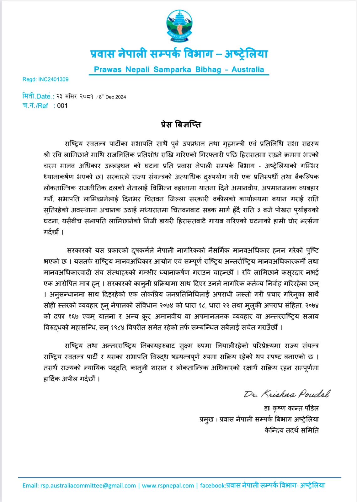 प्रवास नेपाल सम्पर्क विभाग अस्ट्रेलियाका अध्यक्ष डा. कृष्ण कान्त पौडेलद्धारा हस्ताक्षरित विज्ञप्तिमा सरकारले राज्य संयन्त्रको अत्याधिक दुरुपयोग गरी एक प्रतिस्पर्धी तथा बैकल्पिक लोकतान्त्रिक राजनीतिक दलको नेतालाई विभिन्न बहानामा यातना दिने अमानवीय, अपमानजनक व्यबहार गर्ने गरेको भन्दै गम्भीर आपत्ति जनाएको हो । विज्ञप्तीमा लेखिएको छ- दिनभर चितवन जिल्ला सरकारी वकीलको कार्यालयमा बयान गराई राति सुतिरहेको अवस्थामा अचानक उठाई मध्यरातमा चितवनबाट सडक मार्ग हुँदै राति ३ बजे पोखरा पुर्याइएको घटना ,यसैबीच सभापति लामिछानेको निजी डायरी हिरासतबाटै गायब गरिएको घटनाको हामी घोर भर्त्सना गर्दछौं । सरकारको यस प्रकारको दुषकर्मले नेपाली नागरिकको नैसर्गिक मानवअधिकार हनन गरेको भन्दै विभागले यसतर्फ राष्ट्रिय मानवअधिकार आयोग एवं सम्पूणर् राष्ट्रिय अन्तर्राष्ट्रिय मानवअधिकारकर्मी तथा मानवअधिकारवादी संघ संस्थाहरुको गम्भीर ध्यानाकर्षण गराएको छ ।