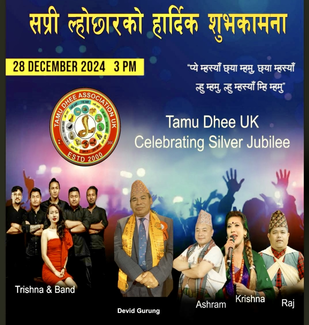 तमु धीं यूकेको रजत महोत्सव तथा ल्होछार कार्यक्रममा प्रस्तुति दिन लोकप्रिय लोक पप गायिका तृष्णा गुरुङ र उनको ‘द कोल्याब ब्यान्ड’ बेलायत आइपुगेका छन् भने कार्यक्रममा प्रस्तुतिका लागि अन्य राष्ट्रिय  कलाकार समेत बेलायत आउने कार्यक्रम रहेको संयोजक कमल कोने गुरुङले बताए ।