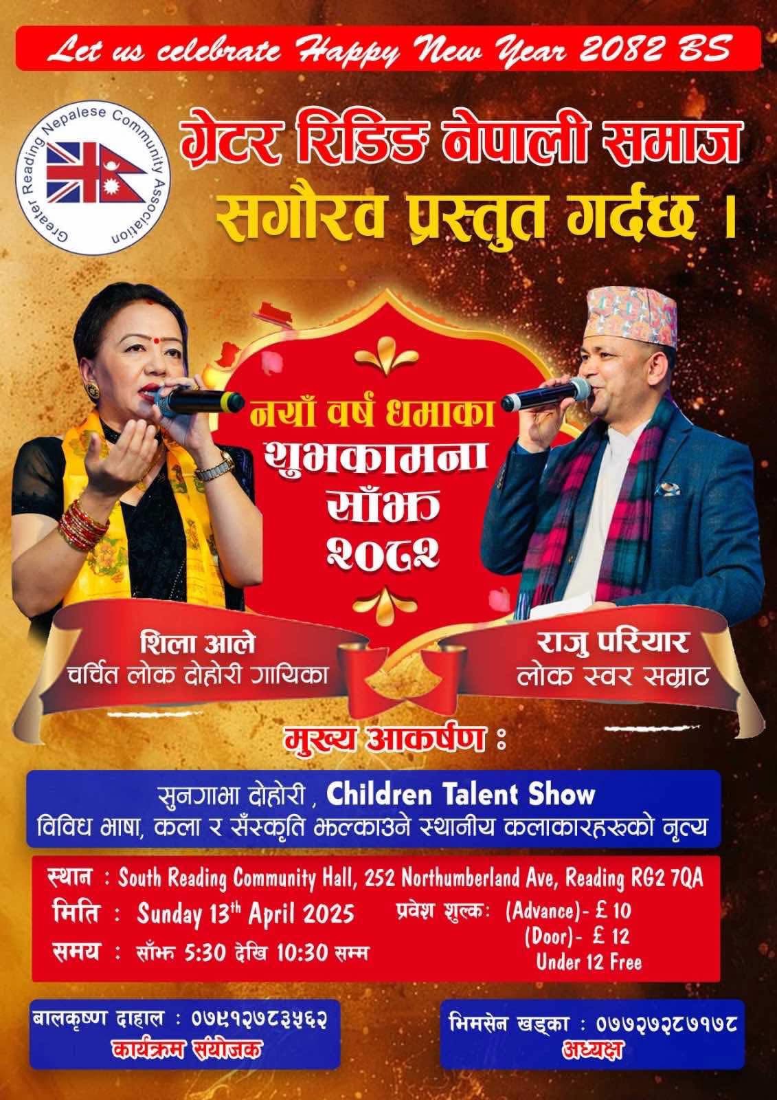 लन्डन। रेडिङ नेपाली समाज यूकेले चर्चित लोक तथा दोहोरी कलाकार राजु परियार र शिला आले सँग नेपाली नयाँ वर्ष २०८२ को शुभकामना आदनप्रदान कार्यक्रम गर्ने भएका छन्।
