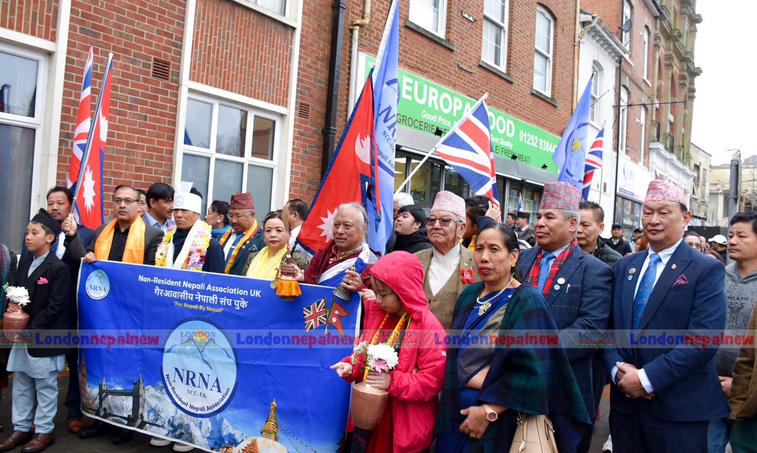एनआरएनए यूकेले उच्चस्तरीय समितिका संयोजक डा. शेष घलेलाई पाइपर र पञ्चेबाजाले स्वागत गर्दै पदयात्रा गरेको छ ।