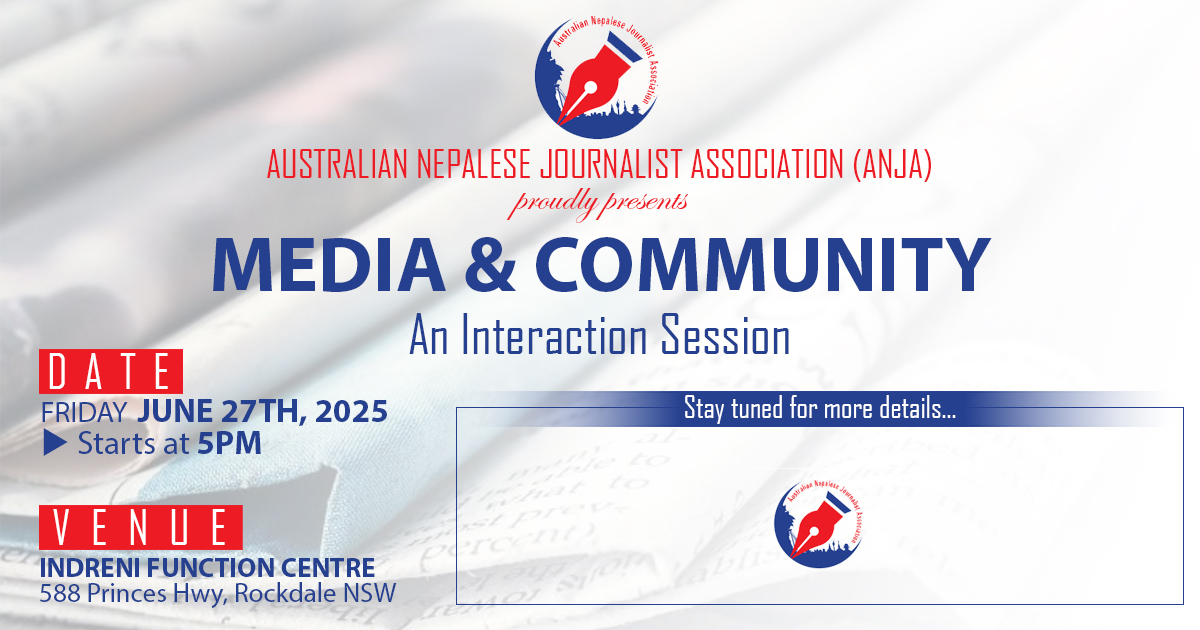 सिड्नी । अस्ट्रेलियामा रहेका क्रियाशिल नेपाली पत्रकारहरुले अस्ट्रेलियामा रहेका सामाजिक अगुवा तथा नेपाली प्रतिनिधि र विभिन्न संघसंस्था बीच अन्तर्क्रिया कार्यक्रम गर्ने भएका छन् । अष्ट्रेलियन नेप्लीज जर्नलिष्ट एसोसिएसन (एन्जा) को आयोजनामा २७ जुन सिड्नीको रक्डेल स्थित ईन्द्रेणी फंक्सन सेन्टरमा ’मिडिया र समुदाय’ विषयक अन्तरक्रिया कार्यक्रम हुने भएको हो । कार्यक्रमले अस्ट्रेलियामा रहेका विभिन्न सांस्कृतिक र व्यावसायिक पृष्ठभूमीका व्यक्तित्वहरु र समुदायहरूलाई जोड्दै त्यसमा सञ्चार माध्यम र समुदाय दुबैको भुमिका र अपेक्षाका विषयमा एक आपसमा साझेदारी गर्ने अवसर प्रदान गर्ने एन्जा अध्यक्ष तिवारीले जानकारी दिए । एन्जाको हाल निर्वाचित कार्यसमितकोे पहिलो सामुदायिक अन्तरक्रिया समेत रहेको उनले बताए ।