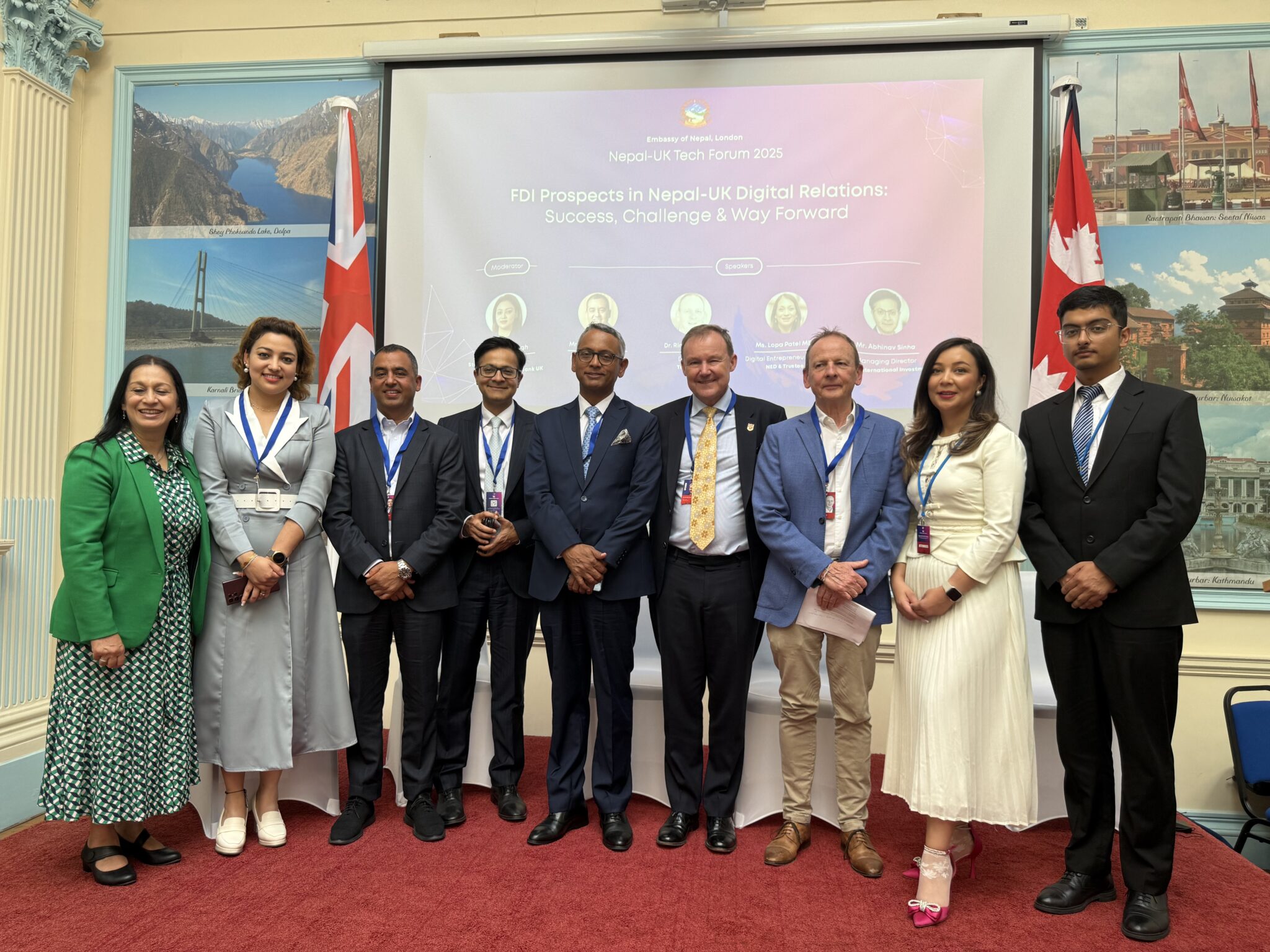 लन्डन।नेपाली दूतावास लण्डनले शुक्रबार दूतावासमै ‘नेपाल–युके टेक फोरम’ सम्पन्न गरेको छ।नेपाल डिजिटल नवप्रवर्तनको उदाउँदो केन्द्रको रूपमा कसरी अघि बढिरहेको छ भन्ने विषयमा प्रकाश पार्न र नेपाल तथा बेलायतबीच प्रविधिको क्षेत्रमा रणनीतिक साझेदारीका अवसरहरू पहिचान गर्न उक्त फोरम गरिएको हो ।