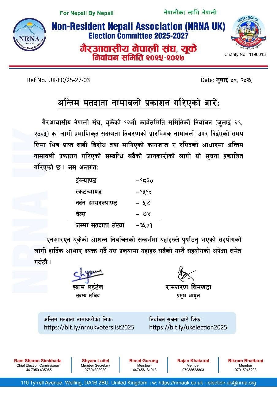 यही सूचीमा प्रकाशित मतदाताले मात्रै आसन्न एनआरएनए यूके निर्वाचनमा भाग लिन पाउनेछन् ।