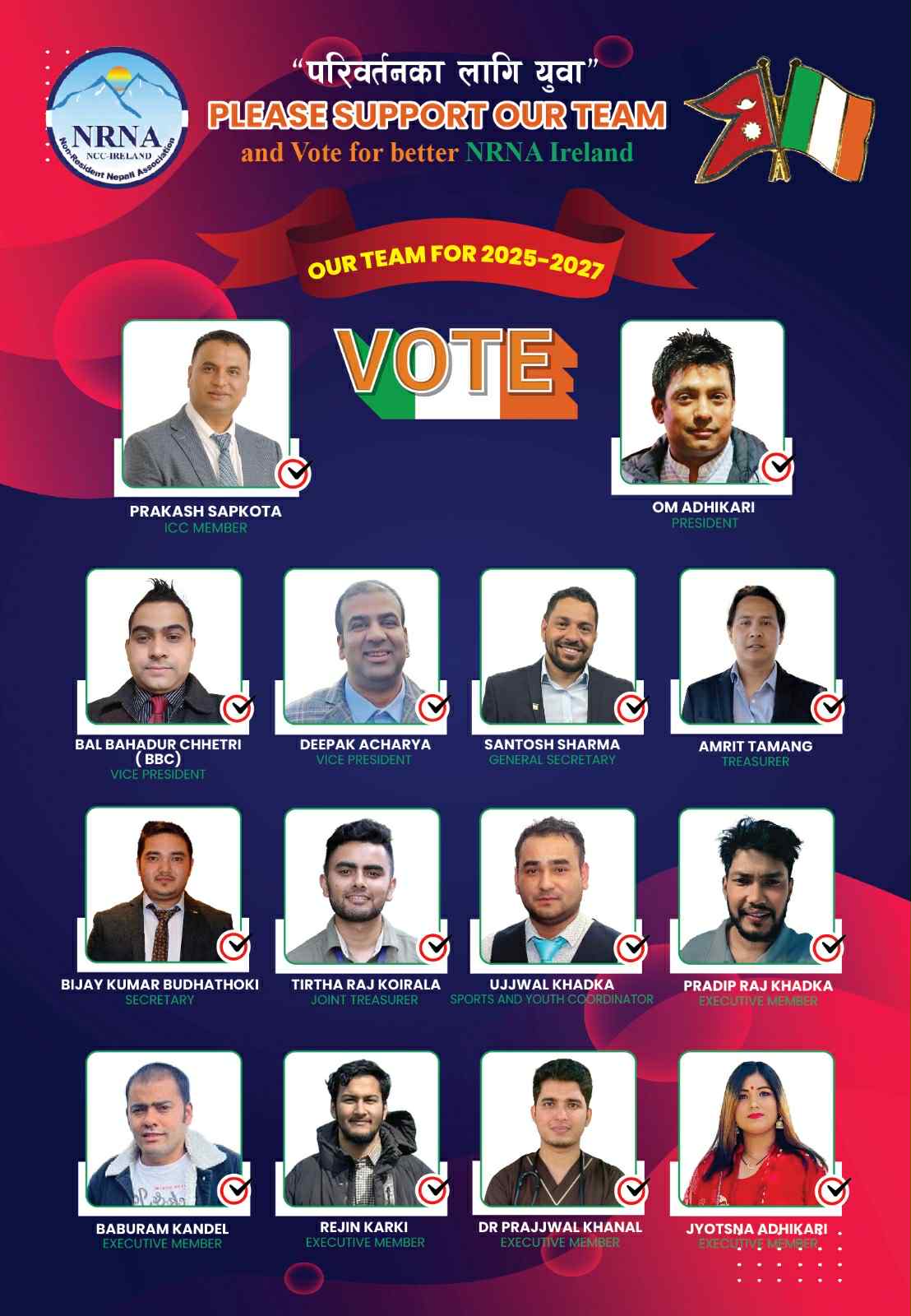 एनआरएन आयरल्यान्डमा ओम अधिकारीको प्यानल सहित उत्रिए १४ युवा चुनाबी मैदानमा-के छन् प्रतिबद्धता ?