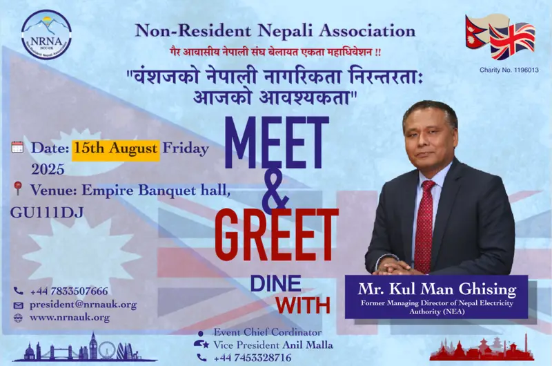 बेलायतमा कुलमान घिसिङ ‘मिट एन्ड ग्रीट’ गर्ने व्यापक तयारी-पाइपर धुनले स्वागत गर्दै अभिनन्दन गरिने