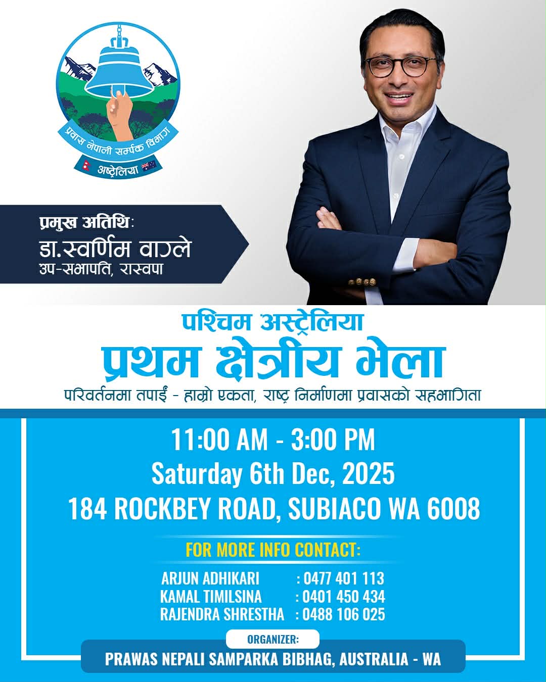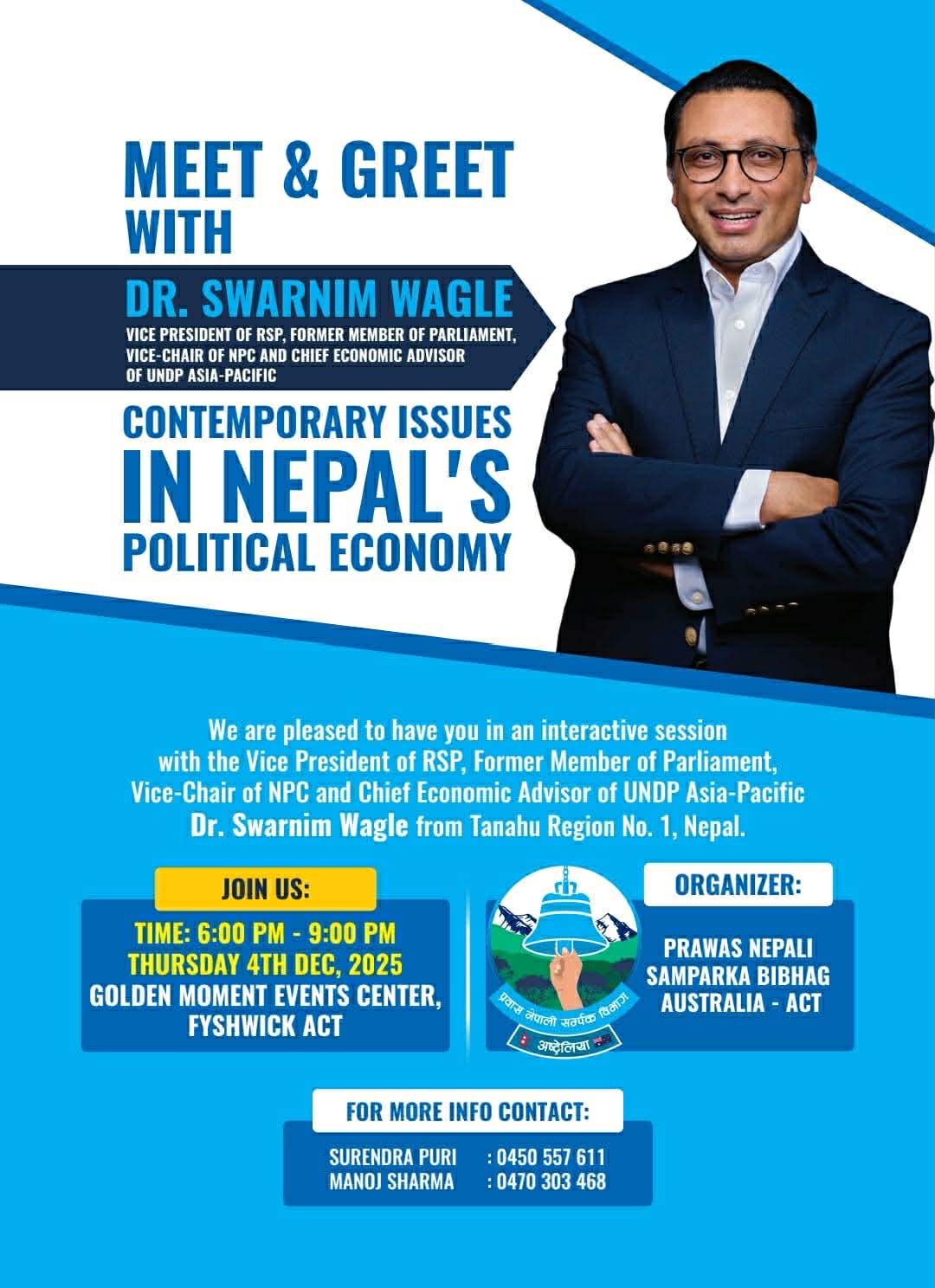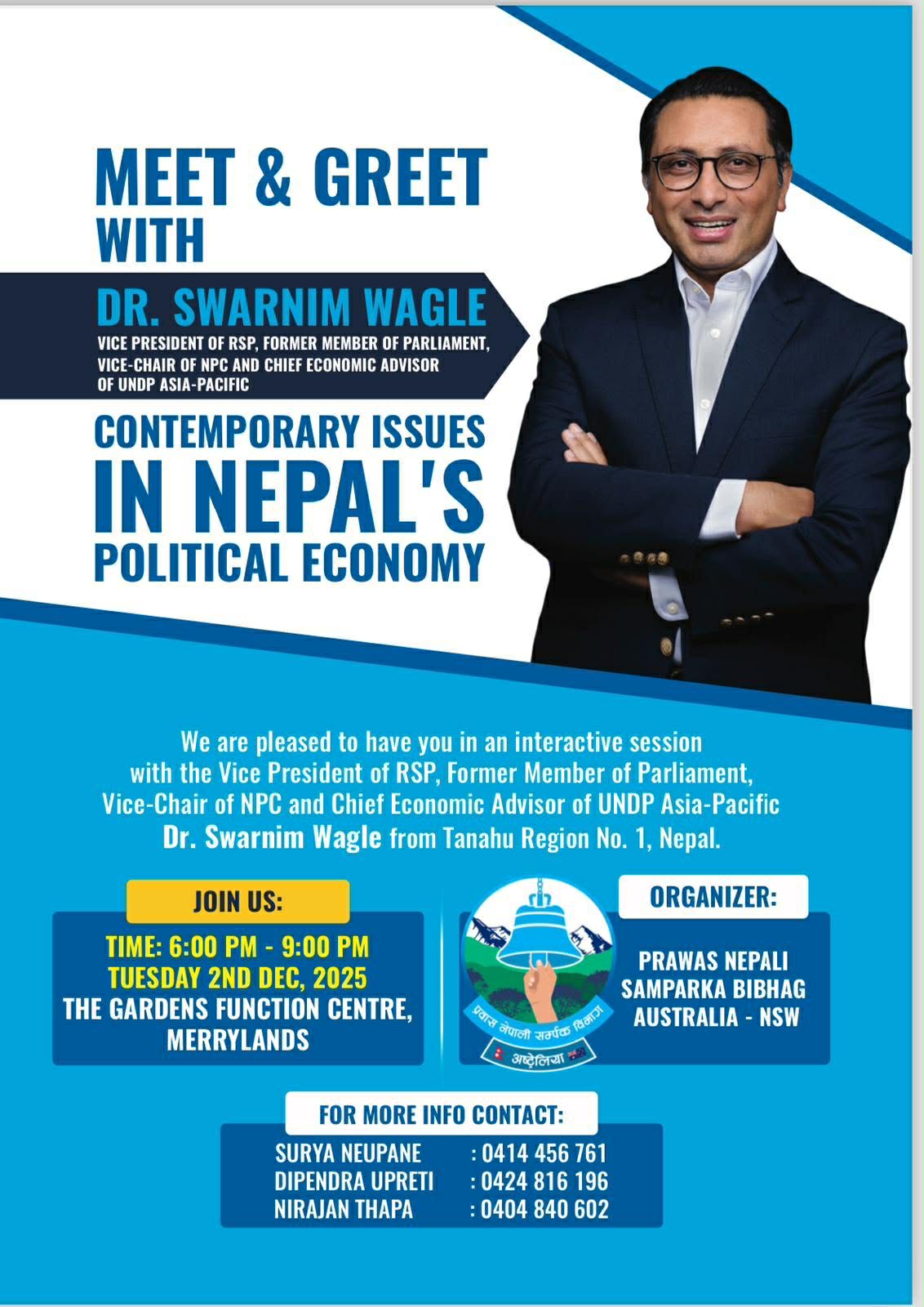 सिड्नी । राष्ट्रिय स्वतन्त्र पार्टीका उपसभापति तथा वरिष्ठ अर्थशास्त्री डा. स्वर्णिम वाग्ले डिसेम्बर पहिलो साता अस्ट्रेलिया भ्रमणमा आउने भएका छन्। डा. स्वर्णिम वाग्लेले अस्ट्रेलियाका तीन सहरमा अन्तर्क्रिया कार्यक्रममार्फत नेपाली समुदायलाई भेट्ने तयारी गरेका छन्। प्रवास नेपाली सम्पर्क विभाग, अष्ट्रेलियाले नेपाली समुदायसँग विचार तथा अनुभव आदान–प्रदान गर्ने उद्देश्यले डिसेम्बर २ गते मङ्गलबार सिड्नीको मेरील्याण्ड्सस्थित द गार्डेन्स फङ्सन सेन्टरमा अन्तरक्रिया कार्यक्रम आयोजना गरेको छ। कार्यक्रम बेलुका ६ बजेदेखि ९ बजेसम्म चल्नेछ। एनएसडब्ल्यु कमिटीका सचिव सूर्य न्यौपानेका अनुसार कार्यक्रममा प्रमुख सहभागिताका रूपमा डा. वाग्ले उपस्थिति रहनेछन् ।