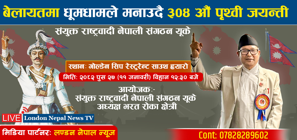 लन्डन । संयुक्त राष्ट्रवादी नेपाली संगठन बेलायतले राष्ट्रनिर्माता पृथ्वी नारायण शाहको ३०४ औं पृथ्वी जयन्ती तथा राष्ट्रिय एकता दिवस मनाउन व्यापक तयारी छ।
