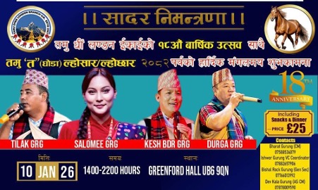 ग्रिनफोर्ड टाउन हल लन्डनमा दिउँसो २ बजेदेखि  वार्षिकोत्स्व तथा ल्होछार कार्यक्रम गरिने अध्यक्ष भरत गुरुङले जानकारी दिए ।