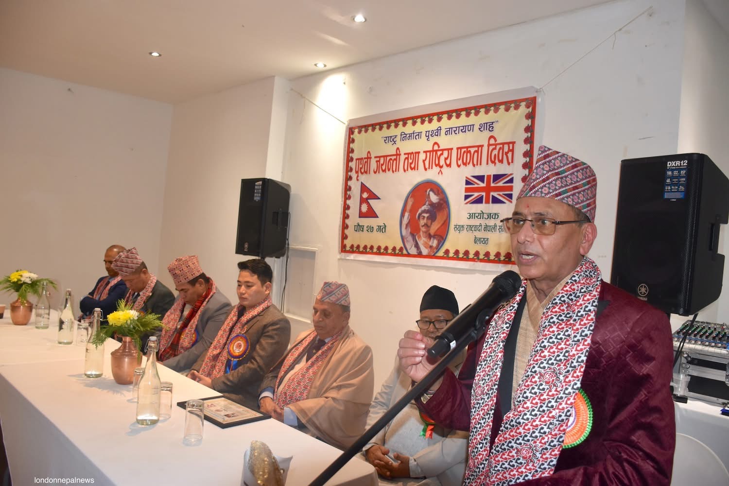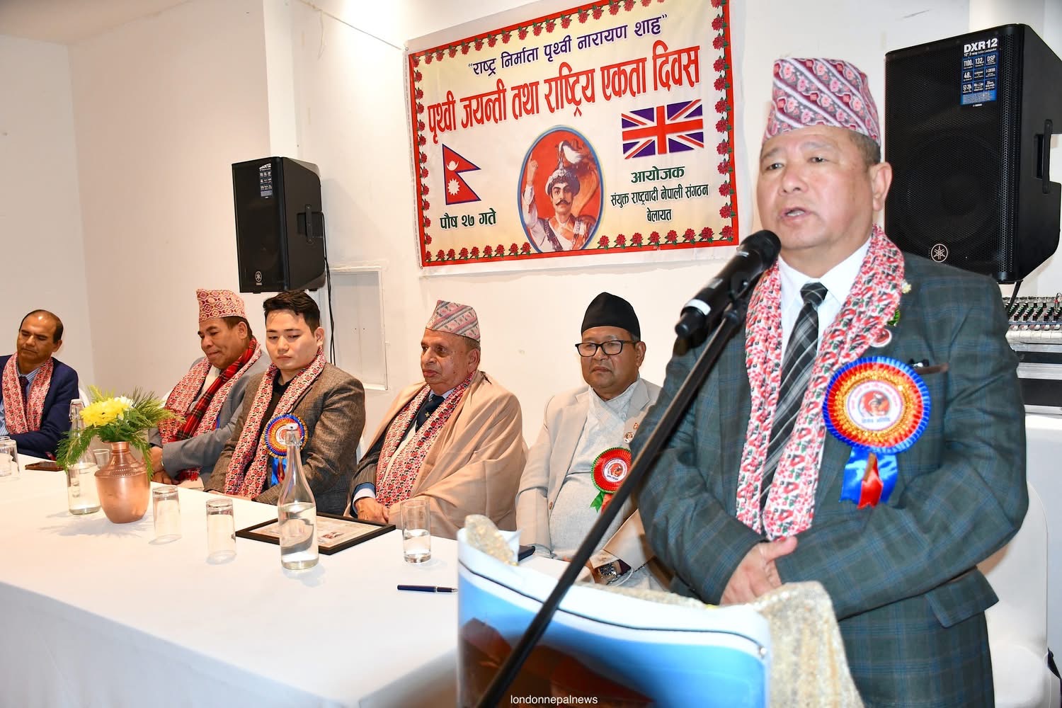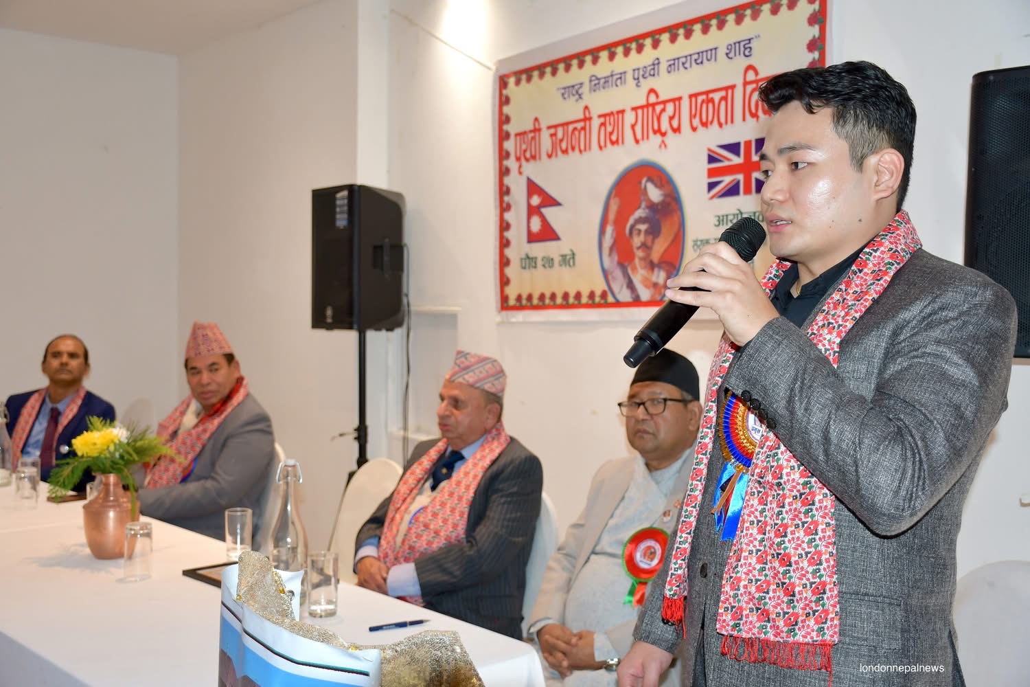 कार्यक्रमलाई सम्बोधन गर्दै विशेष अतिथी डा. राघवप्रसाद धिताल (ओबीइ) हन्स्लो बरोका पूर्व मेयर काउन्सिलर,विष्णु गुरुङ,वुद्धिजिवी विकलचन्द्र आचार्य,एनआरएनए यूकेका प्रमुख संरक्षक डेभिड गुरुङ,नेपाल आर्मीका पूर्व मेजर कुमार बस्नेत ,समाजसेवी विमल आचार्य,प्रेम गौतम, हेमन्त पौडेल, साहित्यकार हरिसिंह थापा,संगठनका महासचिव सुनिलजंग शाह लगायत वक्ताहरुले श्री ५ बडामहाराज पृथ्वीनारायण शाहको योगदानको चर्चा गर्दै नेपाल एकीकरणमा उहाँले पुर्याउनु भएको योगदानको चर्चा गरेका थिए ।