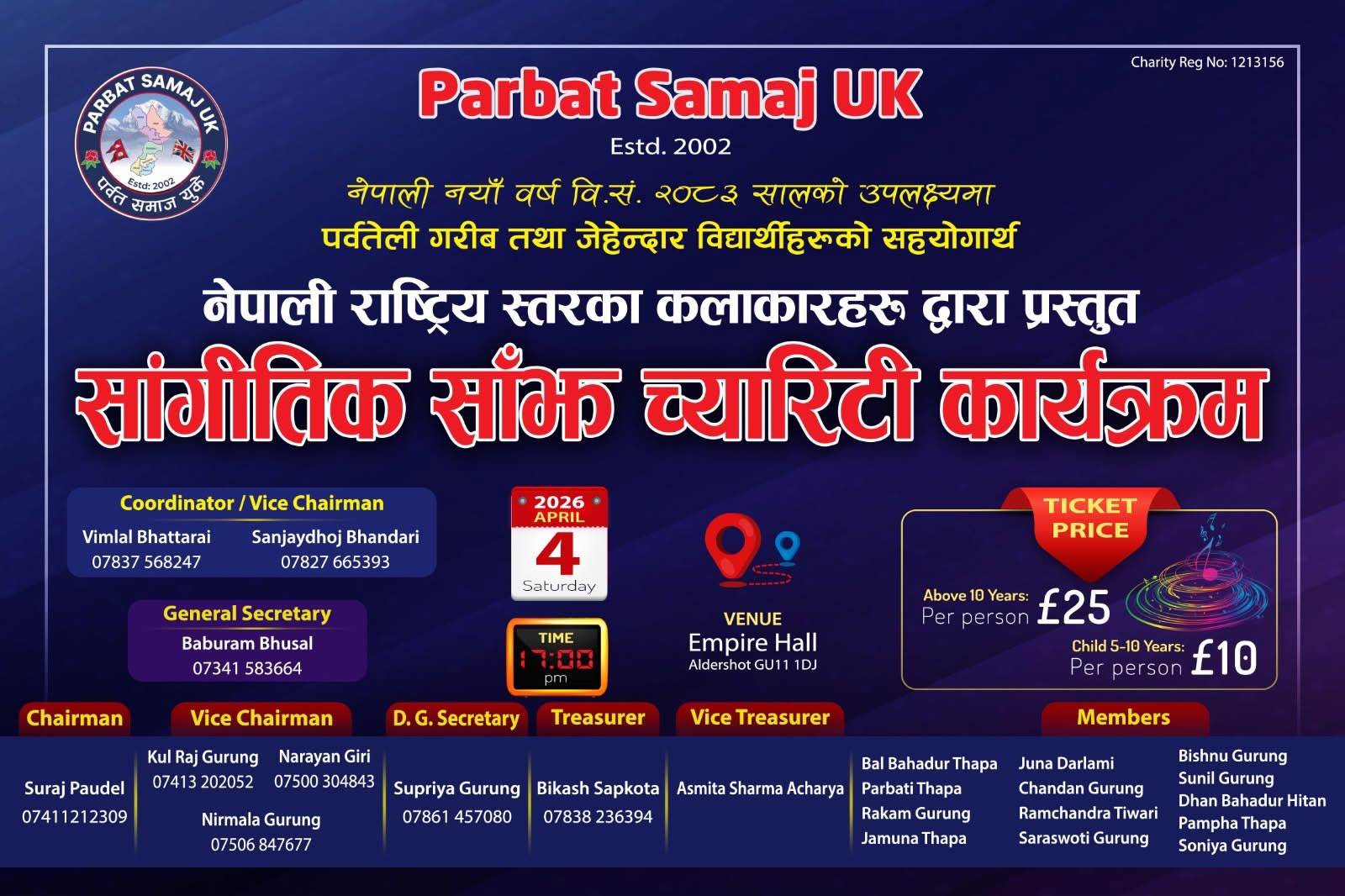 पर्वत समाज यूकेका उपाध्यक्ष सन्जयध्वज भण्डारी र भिमलाल भट्टराईले सयोजन गरेको कार्यक्रममा नेपाली नयाँ वर्ष विशेष समारोह मनाउन बेलायतवासी समस्त नेपालीलाई निमन्त्रणा गरेका छन् ।
