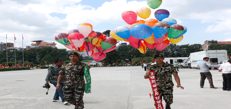 राष्ट्रिय भन्डा, रङ्गीचङ्गी ध्वजापताका र बेलुनले संविधानसभा परिसर सजिसजाउ देखिएको छ । समारोहमा विशिष्ट व्यक्तिको आगमनको क्रम सुरु भएको छ ।
