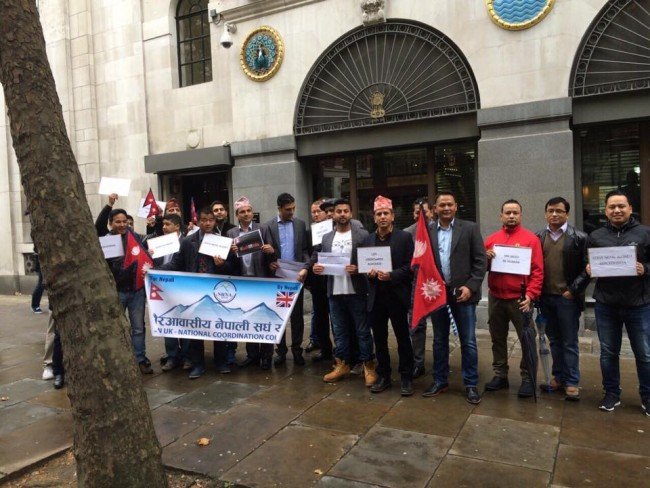 लण्डनको भारतीय हाइ कमिसन अगाडी बिहान साढे १० बजे प्रदर्शन गरिएको थियो प्रदर्शनमा सहभागीहरुले नेपालको रास्ट्रिय झण्डाका साथै नेपालमा भारतीय नाकाबन्दी र हस्तक्षेपविरुद्धका प्लेकार्ड बोकेका थिए ।