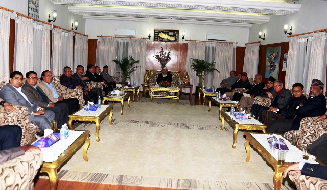 प्रधानमन्त्री केपी शर्मा ओलीले बोलाएको सर्वदलीय बैठकमा सहभागी नेताहरु । तस्बिरः रासस