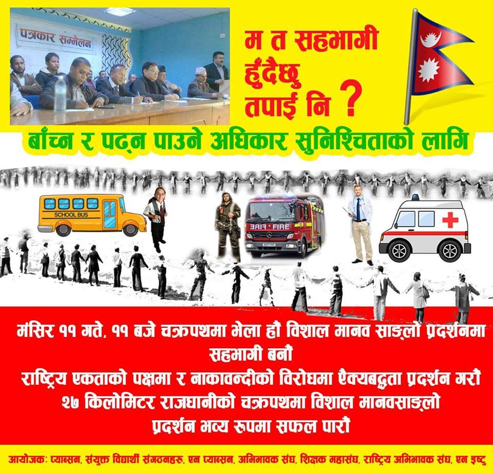 ‘बाँच्न र पढ्न देऊ’ भन्ने मुख्य नाराका साथ शुक्रबार बिहान ११ बजे कलङ्की, सातदोबाटो, कोटेश्वर, चाबहिल, महाराजगञ्ज चक्रपथ, बालाजु, स्वयम्भु हुँदै पुनःकलङ्कीसम्म मानव साङलो तयार गर्ने छन् ।