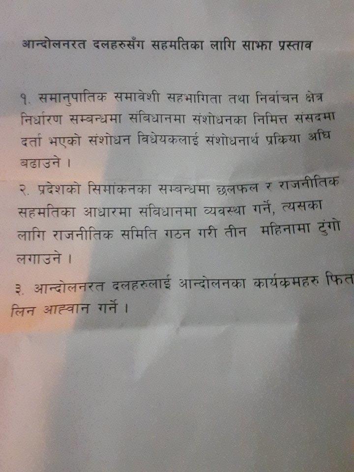 दलहरूले तयार गरेको साझा प्रस्तावमा ‘प्रदेशको सीमाङ्कनका सम्बन्धमा छलफल र राजनीतिक सहमतिका आधारमा संविधानमा व्यवस्था गर्ने र त्यसका लागि राजनीतिक समिति गठन गरी तीन महिनामा टुङ्गो लगाउने’ उल्लेख छ । बैठकमा सहभागी दलहरुले ‘आन्दोलनरत दलहरूलाई आन्दोलनका सबै कार्यक्रमहरू फिर्ता लिन आह्वान गर्ने’ निर्णयसमेत गरेका छन् ।