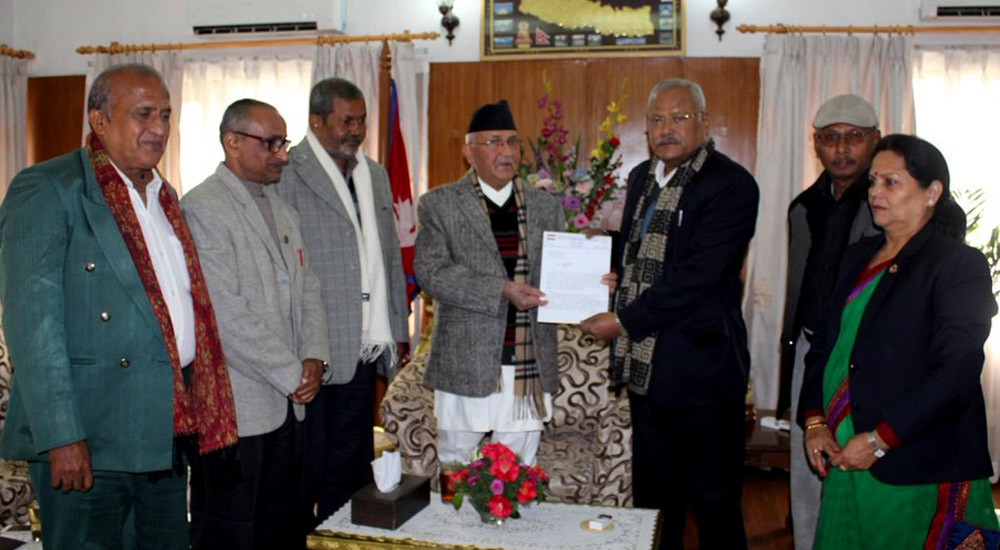 फोरम लोकतान्त्रिकका अध्यक्ष तथा उपप्रधान एवं भौतिक योजना मन्त्री विजयकुमार गच्छदार नेतृत्वको टोलीले प्रधानमन्त्री ओलीलाई ज्ञापनपत्र बुझाउँदै सरकार गठनका बेला भएको सहमति कार्यान्वयनका लागि आग्रह गरेको हो ।