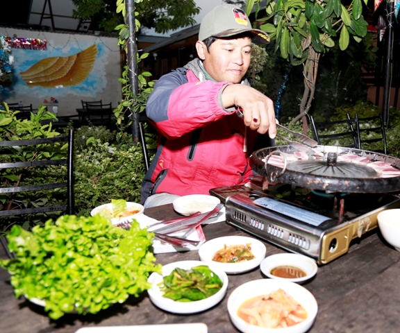 काठमाडौँको प्रसिद्ध पर्यटकीयस्थल ठमेलको ह्याङकुक सराङ रेष्टुरेण्टमा कोरियन खाना तयार गरिँदै । पछिल्लो समयमा युवा पुस्तामाझ कोरियन खानाका परिकार लोकप्रिय हुँदै गएको छ । तस्बिर : रोशन सापकोटा