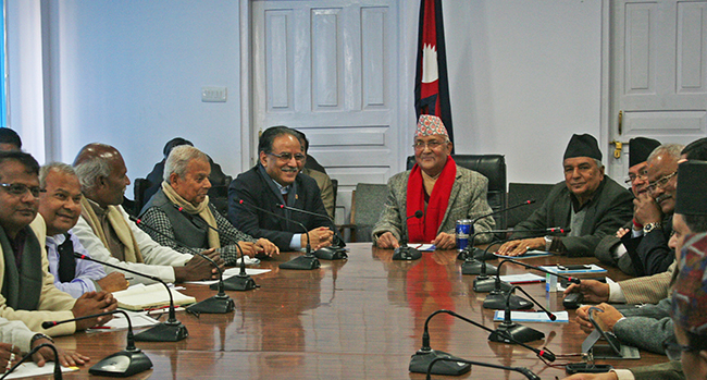 सोमबार अपराह्न बालुवाटारस्थित निवासमा प्रधानमन्त्री केपी ओलीले कांग्रेस सभापति सुशील कोइराला र एकीकृत माओवादी अध्यक्ष पुष्पकमल दाहालसँग झन्डै २ घण्टा परामर्श गरे ।