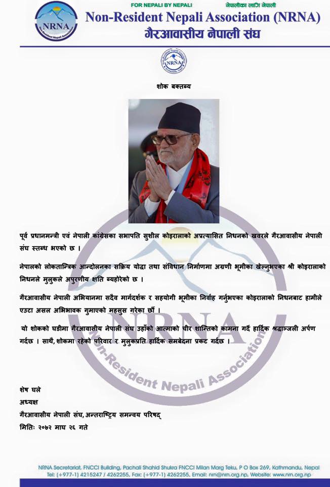 मंगलबार बिहान एक शोक बक्तव्य जारी गर्दै घलेले कोइरालाको निधनबाट एनआरएनले आफ्नो अविभावक गुमाएको जनाउनुभएको छ । विज्ञप्तिमा नेपालको लोकतान्त्रिक आन्दोलनका सक्रिय योद्धा तथा संविधान निर्माणमा अग्रणी भूमीका खेलेका सुशील कोइरालाको निधनले मुलुकले अपुरणीय क्षति ब्यहोरेको उल्लेख छ ।