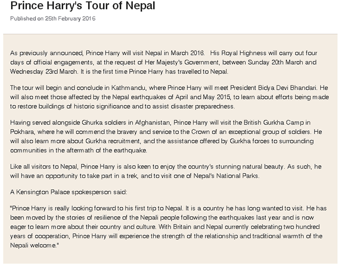 केन्जिङ्टन प्यालेसले बिहीबार विज्ञप्तिमार्फत भ्रमण मिति तय भएको औपचारिक जानकारी दिएको हो । विज्ञप्तीमा दिइएको जानकारी अनुसार ह्यारीले आगामी २० मार्च आइतबारदेखि २३ मार्च बुधवारसम्म नेपाल भ्रमण गर्ने भएका हुन् ।