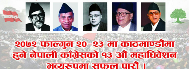 काठमाडौं- नेपाली कांग्रेसको १३ औं महाधिवेशन आजबाट काठमाडौंमा शुरु हुँदैछ । महाधिवेशनको उद्घाटन दिउँसो १ बजे खुलामञ्चबाट गर्ने कार्यक्रम छ ।